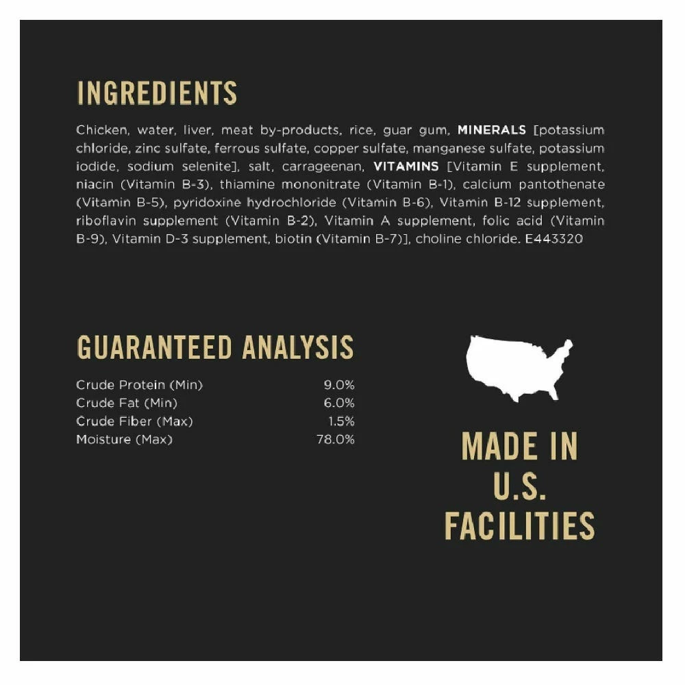 Chicken, Water, Liver, Meat By-Products, Rice, Guar Gum, Minerals [Potassium Chloride, Zinc Sulfate, Ferrous Sulfate, Copper Sulfate, Manganese Sulfate, Potassium Iodide, Sodium Selenite], Salt, Carrageenan, Vitamins [Vitamin E Supplement, Niacin (Vitamin B-3), Thiamine Mononitrate (Vitamin B-1), Calcium Pantothenate (Vitamin B-5), Pyridoxine Hydrochloride (Vitamin B-6), Vitamin B-12 Supplement, Riboflavin Supplement (Vitamin B-2), Vitamin A Supplement, Folic Acid (Vitamin B-9), Vitamin D-3 Supplement, Biotin (Vitamin B-7)], Choline Chloride. E443320.