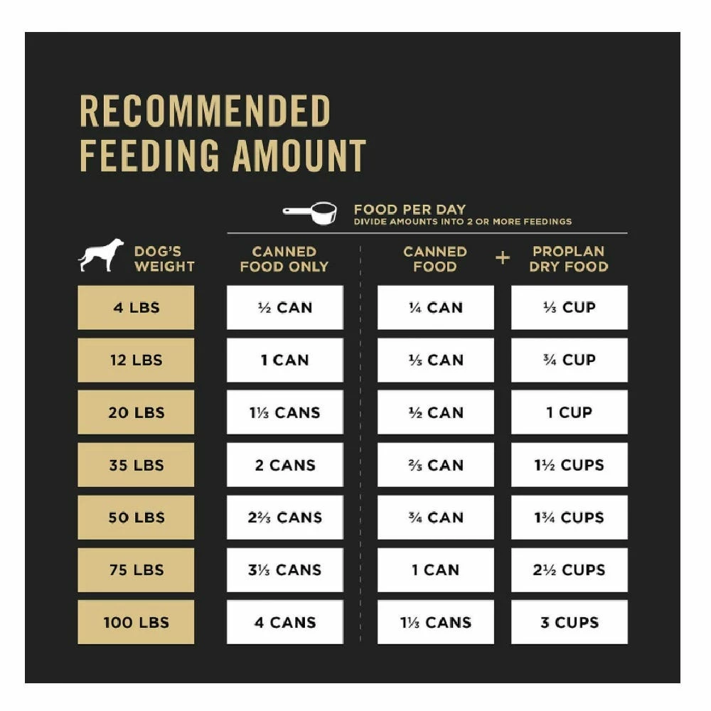 Divide amounts into 2 or more feedings. The exact amount your dog requires will vary according to age, activity and environment. Adjust as needed to maintain your dog in ideal body condition. Provide adequate fresh water in a clean container daily. For your pet’s health, see your veterinarian regularly.