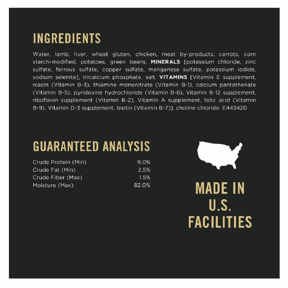 Water, Lamb, Liver, Wheat Gluten, Chicken, Meat By-Products, Carrots, Corn Starch modified, Potatoes, Green Beans, Minerals [Potassium Chloride, Zinc Sulfate, Ferrous Sulfate, Copper Sulfate, Manganese Sulfate, Potassium Iodide, Sodium Selenite], Tricalcium Phosphate, Salt, Vitamins [Vitamin E Supplement, Niacin (Vitamin B-3), Thiamine Mononitrate (Vitamin B-1), Calcium Pantothenate (Vitamin B-5), Pyridoxine Hydrochloride (Vitamin B-6), Vitamin B-12 Supplement, Riboflavin Supplement (Vitamin B-2), Vitamin A Supplement, Folic Acid (Vitamin B-9), Vitamin D-3 Supplement, Biotin (Vitamin B7)], Choline Chloride. E443420.
