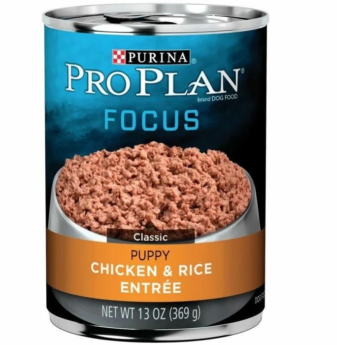 Nourish your growing puppy when you serve him Purina Pro Plan FOCUS Chicken & Rice Entree Classic puppy wet dog food. This recipe features real chicken as the #1 ingredient and provides specialized nutrition to meet the unique needs of growing puppies in their first year. Purposeful nutrients in this canned puppy food help support his developing immune system. Formulated with DHA, an omega-3 fatty acid, Purina Pro Plan FOCUS Chicken and Rice Entree can help nourish brain and vision development and is rich in omega-6 fatty acids to help promote his healthy skin and coat. This puppy dog food features a tender texture to enrich your puppy’s mealtime experience, keeping him interested in the food you put in his dish. Help your beloved puppy be his best every day when you make this Purina Pro Plan FOCUS formula part of his regular feeding routine.