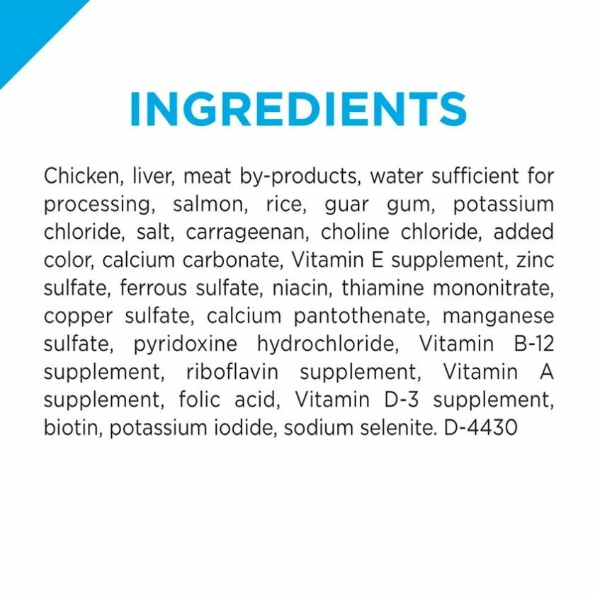 Chicken, water sufficient for processing, liver, meat by-products, brewers rice, potassium chloride, guar gum, salt, tricalcium phosphate, carrageenan, added color, zinc sulfate, choline chloride, calcium phosphate, Vitamin E supplement, ferrous sulfate, copper sulfate, thiamine mononitrate, manganese sulfate, Vitamin A supplement, niacin, calcium pantothenate, Vitamin B-12 supplement, riboflavin supplement, pyridoxine hydrochloride, potassium iodide, Vitamin D-3 supplement, folic acid, sodium selenite, biotin.
