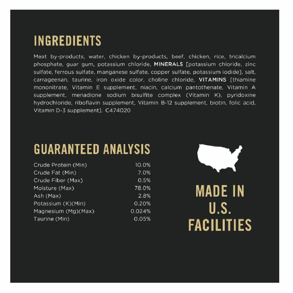 Meat By-Products, Water, Chicken By-Products, Beef, Chicken, Rice, Tricalcium Phosphate, Guar Gum, Potassium Chloride, Minerals [Potassium Chloride, Zinc Sulfate, Ferrous Sulfate, Manganese Sulfate, Copper Sulfate, Potassium Iodide], Salt, Carrageenan, Taurine, Iron Oxide Color, Choline Chloride, Vitamins [Thiamine Mononitrate, Vitamin E Supplement, Niacin, Calcium Pantothenate, Vitamin A Supplement, Menadione Sodium Bisulfite Complex (Vitamin K), Pyridoxine Hydrochloride, Riboflavin Supplement, Vitamin B-12 Supplement, Biotin, Folic Acid, Vitamin D-3 Supplement]. C474020.