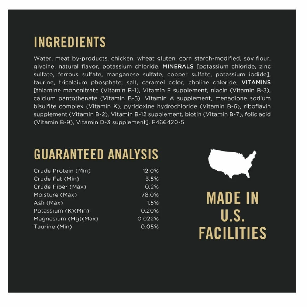 Water, Meat By-Products, Chicken, Wheat Gluten, Corn Starch-Modified, Soy Flour, Glycine, Natural Flavor, Potassium Chloride, Minerals [Potassium Chloride, Zinc Sulfate, Ferrous Sulfate, Manganese Sulfate, Copper Sulfate, Potassium Iodide], Taurine, Tricalcium Phosphate, Salt, Caramel Color, Choline Chloride, Vitamins [Thiamine Mononitrate (Vitamin B-1), Vitamin E Supplement, Niacin (Vitamin B-3), Calcium Pantothenate (Vitamin B-5), Vitamin A Supplement, Menadione Sodium Bisulfite Complex (Vitamin K), Pyridoxine Hydrochloride (Vitamin B-6), Riboflavin Supplement (Vitamin B-2), Vitamin B-12 Supplement, Biotin (Vitamin B-7), Folic Acid (Vitamin B-9), Vitamin D-3 Supplement]. F466420