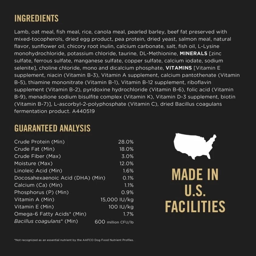 Lamb, Oat Meal, Fish Meal, Rice, Canola Meal, Pearled Barley, Beef Fat Preserved With Mixed-Tocopherols, Dried Egg Product, Pea Protein, Dried Yeast, Salmon Meal, Natural Flavor, Sunflower Oil, Chicory Root Inulin, Calcium Carbonate, Salt, Fish Oil, L-Lysine Monohydrochloride, Potassium Chloride, Taurine, Dl-Methionine, Minerals [Zinc Sulfate, Ferrous Sulfate, Manganese Sulfate, Copper Sulfate, Calcium Iodate, Sodium Selenite], Choline Chloride, Mono And Dicalcium Phosphate, Vitamins [Vitamin E Supplement, Niacin (Vitamin B-3), Vitamin A Supplement, Calcium Pantothenate (Vitamin B-5), Thiamine Mononitrate (Vitamin B-1), Vitamin B-12 Supplement, Riboflavin Supplement (Vitamin B-2), Pyridoxine Hydrochloride (Vitamin B-6), Folic Acid (Vitamin B-9), Menadione Sodium Bisulfite Complex (Vitamin K), Vitamin D-3 Supplement, Biotin (Vitamin B-7)], L-Ascorbyl-2-Polyphosphate (Vitamin C), Dried Bacillus Coagulans Fermentation Product.
