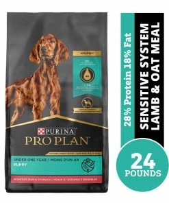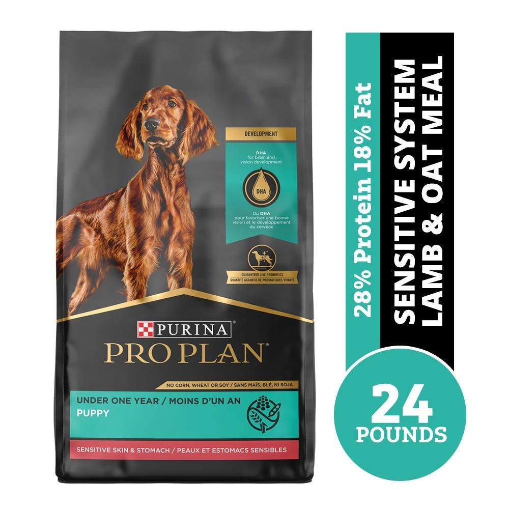 Support your puppy’s healthy growth with the targeted nutrition in Purina Pro Plan Puppy Sensitive Skin & Stomach Lamb & Oatmeal Formula dry puppy food. Rich in the nutrients puppies need during their first year of development, this crunchy kibble formula features lamb as the first ingredient and oatmeal, which is gentle on his sensitive stomach. Omega-6 fatty acids in sunflower oil along with vitamin A nourish your puppy’s skin and coat, while antioxidants support his developing immune system. To care for your puppy’s digestive health, this sensitive stomach puppy food contains natural prebiotic fiber that nourishes specific intestinal bacteria. We also fortify his dry puppy food with guaranteed live probiotics for digestive and immune health. To support his brain and vision development, we include DHA from omega-rich fish oil. Your puppy’s bones and teeth get the support they need for strength from the calcium, phosphorus and other minerals in this targeted development formula. This high protein puppy food supplies 100% complete and balanced nutrition that gives him everything he needs to thrive, and it’s made with no artificial colors or flavors. Put Purina Pro Plan Puppy Sensitive Skin & Stomach Lamb & Oatmeal Formula dry puppy food in your little guy’s bowl to ensure he gets a great start in life.