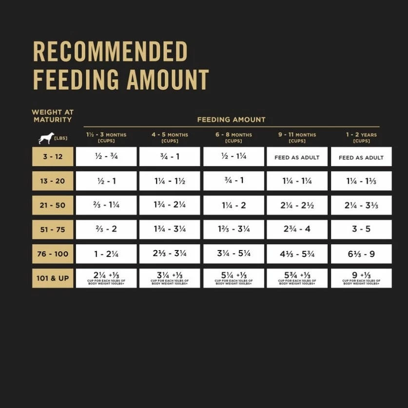 We recommend that you keep your dog in ideal body condition and not allow your dog to become overweight. The exact amount of food your dog requires will need to be adjusted according to age, activity and environment. But a good place to start is with these guidelines for an average, active, adult dog fed once daily. Provide adequate fresh water in a clean container daily.