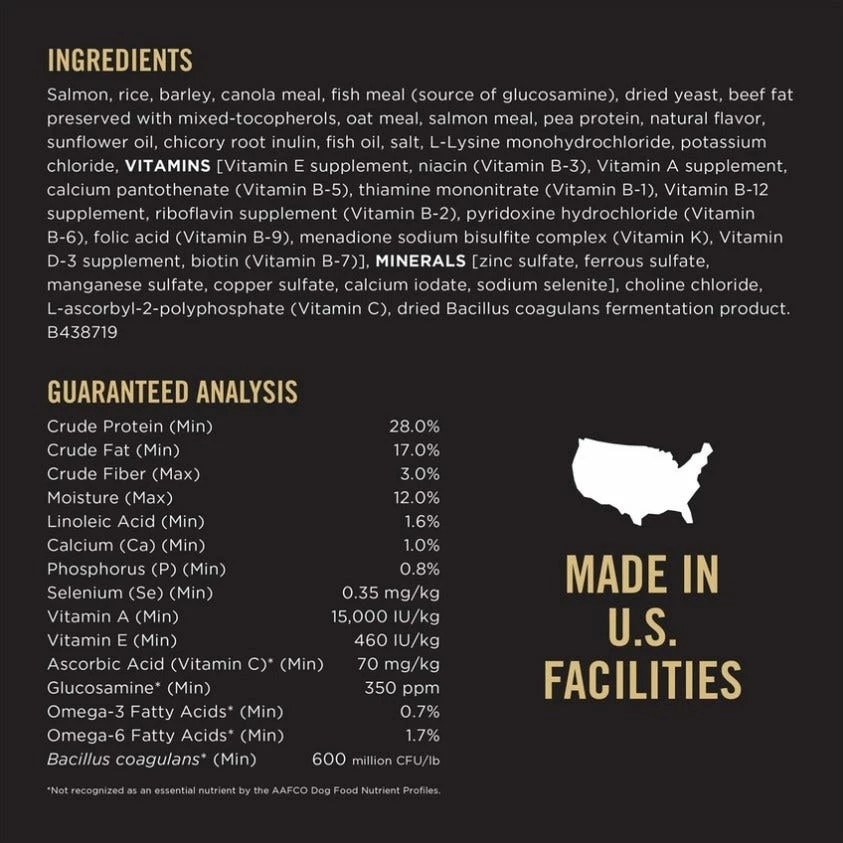 Salmon, Rice, Barley, Canola Meal, Fish Meal (Source Of Glucosamine), Dried Yeast, Beef Fat Preserved With Mixed-tocopherols, Oat Meal, Salmon Meal, Pea Protein, Natural Flavor, Sunflower Oil, Chicory Root Inulin, Fish Oil, Salt, L-lysine Monohydrochloride, Potassium Chloride, Vitamins [Vitamin E Supplement, Niacin (Vitamin B-3), Vitamin A Supplement, Calcium Pantothenate (Vitamin B-5), Thiamine Mononitrate (Vitamin B-1), Vitamin B-12 Supplement, Riboflavin Supplement (Vitamin B-2), Pyridoxine Hydrochloride (Vitamin B-6), Folic Acid (Vitamin B-9), Menadione Sodium Bisulfite Complex (Vitamin K), Vitamin D-3 Supplement, Biotin (Vitamin B-7)], Minerals [Zinc Sulfate, Ferrous Sulfate, Manganese Sulfate, Copper Sulfate, Calcium Iodate, Sodium Selenite], Choline Chloride, L-ascorbyl-2-polyphosphate (Vitamin C), Dried Bacillus Coagulans Fermentation Product. B438719.