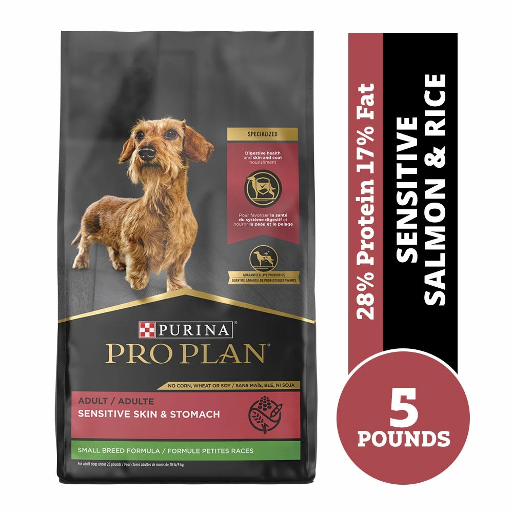 Help your small dog to be his best every day with Purina Pro Plan Brand Sensitive Skin and Stomach Small Breed Formula adult dry dog food. This highly digestible recipe features salmon as the first ingredient, and every high-quality ingredient is carefully selected for a specific nutritional or functional purpose. Easily digestible oat meal in every serving is gentle on his digestive system, while natural prebiotic fiber nourishes specific intestinal bacteria for digestive health. Made without corn, wheat or soy, and without poultry by-product meal, this dry dog food formula gives him wholesome goodness in every bowlful. Your dog gets the specialized nutrition he needs for a healthy, happy life, along with 23 essential vitamins and minerals to help support his overall health and wellness. Give your canine companion a mealtime option formulated specifically for small dogs under 20 pounds, and show him how important his health and happiness are to you.
