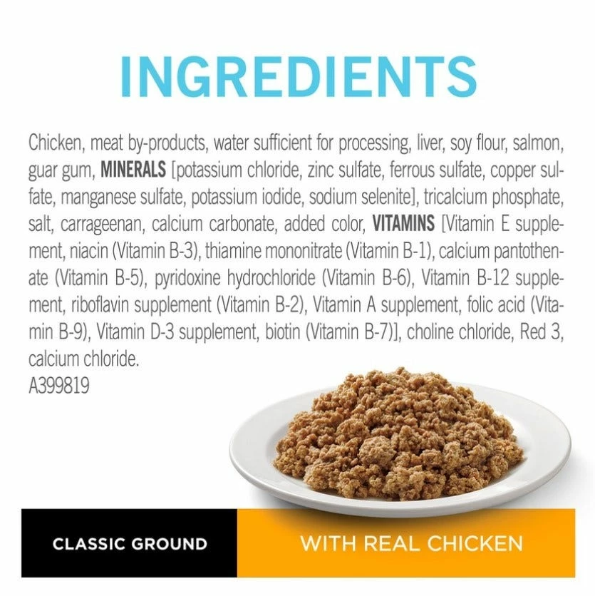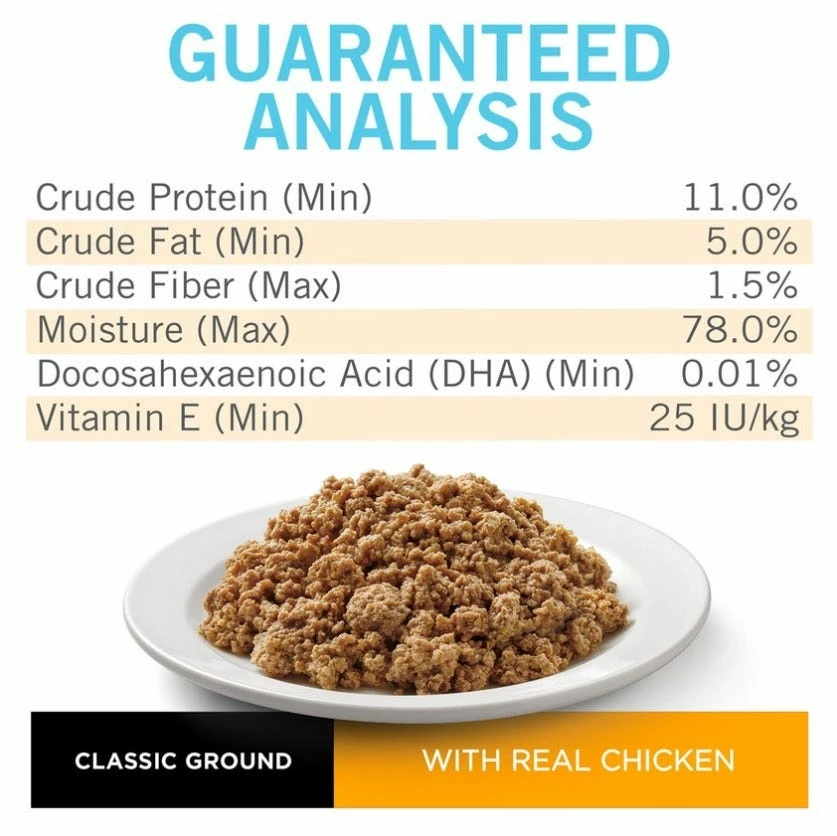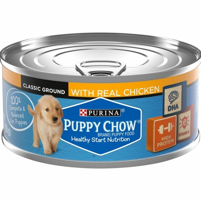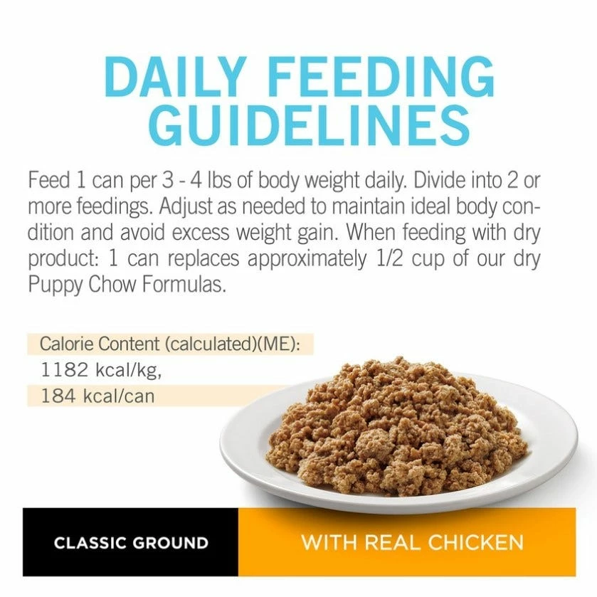 Start life with your new puppy on the right paw by feeding him Purina Puppy Chow With Real Chicken wet puppy food. Made with real chicken, this high-protein canned puppy food is thoughtfully formulated to meet the unique nutritional needs of growing puppies. Each serving contains DHA, an omega-3 fatty acid, for brain and vision development and antioxidants, including vitamin E, to help support his healthy skin and coat. He gets 100% complete and balanced nutrition for puppies in each bowl along with the great taste puppies love. The Healthy Start Nutrition blend in this wet puppy food provides 100% of the essential nutrients for your puppy’s first year in a ground loaf that’s easy for his small mouth to manage. When you open a can of Purina Puppy Chow With Real Chicken wet puppy food, you can be confident he’s getting the high-quality nutrition he needs to thrive.