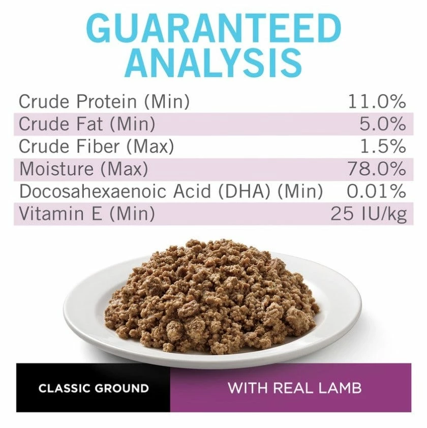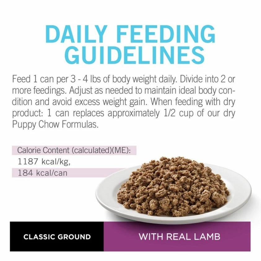 Make your new puppy’s healthy development your #1 priority by feeding him Purina Puppy Chow With Real Lamb wet puppy food. While savoring each delicious mouthful of this high-protein entrée, he gets a 100% complete and balanced meal that provides all the essential nutrients he needs to support his rapidly growing body. We make our canned puppy food formula with high quality protein he needs to build strong muscles. DHA helps support his brain and vision development, and vitamin E promotes a healthy skin and coat. This wet puppy food with real lamb is soft and easy for him to nibble. You can trust Purina Puppy Chow’s Healthy Start Nutrition to provide a great-tasting meal that meets his nutritional needs. When you open a can of Purina Puppy Chow With Real Lamb wet puppy food, feel confident you’re doing the very best to help your newest family member grow up to be a strong, active and happy adult dog.