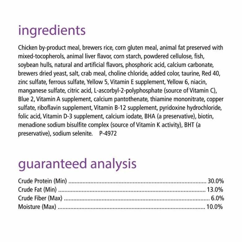 Chicken By-Product Meal, Brewers Rice, Corn Gluten Meal, Animal Fat Preserved with Mixed-Tocopherols, Animal Liver Flavor, Corn Starch, Powdered Cellulose, Fish, Soybean Hulls, Natural and Artificial Flavors, Phosphoric Acid, Calcium Carbonate, Brewers Dried Yeast, Salt, Crab Meal, Choline Chloride, Added Color, Taurine, Red 40, Zinc Sulfate, Ferrous Sulfate, Yellow 5, Vitamin E Supplement, Yellow 6, Niacin, Manganese Sulfate, Citric Acid, L-Ascorbyl-2-Polyphosphate (Source of Vitamin C), Blue 2, Vitamin A Supplement, Calcium Pantothenate, Thiamine Mononitrate, Copper Sulfate, Riboflavin Supplement, Vitamin B-12 Supplement, Pyrodoxine Hydrochloride, Folic Acid, Vitamin D-3 Supplement, Calcium Iodate, BHA (a Preservative), Biotin, Menadione Sodium Bislufite Complex (Source of Vitamin K Activity), Bht (a Preservative), Sodium Selenite.