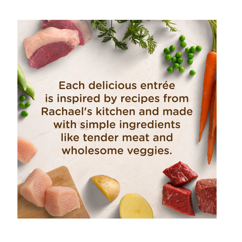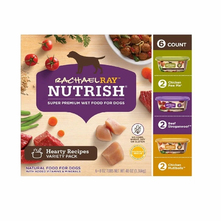 Rachael Ray Nutrish Natural Variety Pack Wet Dog Food delivers delicious stew, every night. Inspired by Rachael Ray’s own recipes, these nutritious meals are made with simple ingredients like tender meat and wholesome veggies simmered in savory gravy. There’s no corn, wheat, soy or gluten, and you won’t find any meat or poultry by-products in these tasty dinners. This multipack includes deliciously natural meals — Chicken Paw Pie (2), Beef Stroganwoof (2), and Chick Paw Pie (2). These stews are full of the high-quality protein your pup needs, with two grain-free options.
