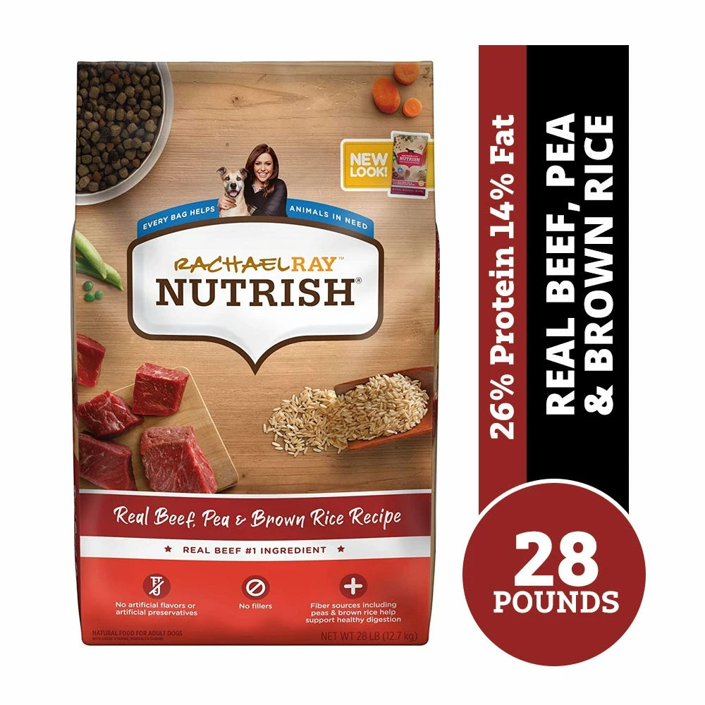 Paw-pare your pup for the day with Rachael Ray Nutrish Real Beef, Pea & Brown Rice Recipe Dry Dog Food. This delicious, super premium dry food for dogs features real beef as the number one ingredient—a protein source that supports healthy organs and lean muscle mass. It is formulated to support healthy digestion while encouraging energy levels with fiber-filled peas and brown rice. This high-quality dry dog food is rich in omega-6 and omega-3 fatty acids—supporting a healthy coat and skin—naturally found in flavorful chicken fat. Vitamins, minerals and taurine are also added to help keep your furry buddy living his best life!