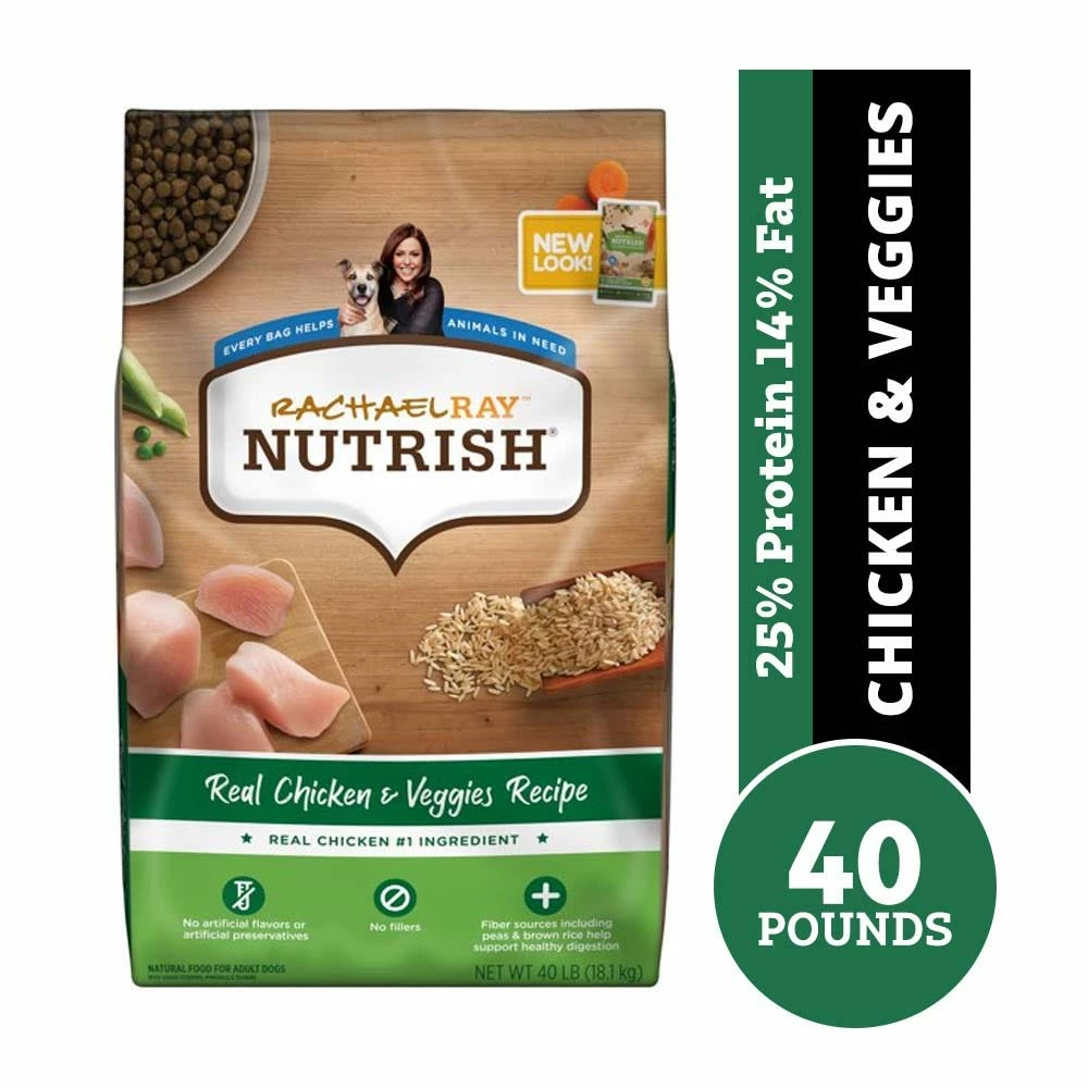 Get your good boy ready to take on the day with Rachael Ray Nutrish Real Chicken & Veggies Recipe Dry Dog Food. This delicious, super premium dry food for dogs features real chicken as the number one ingredient—a protein source that supports healthy organs and lean muscle mass. It is formulated to support healthy digestion while encouraging energy levels with tasty peas and fiber-filled brown rice. This high-quality dry dog food is rich in omega-6 and omega-3 fatty acids—supporting a healthy coat and skin—naturally found in flavorful chicken fat. Vitamins, minerals and taurine are also added to help keep your furry buddy living his best life!