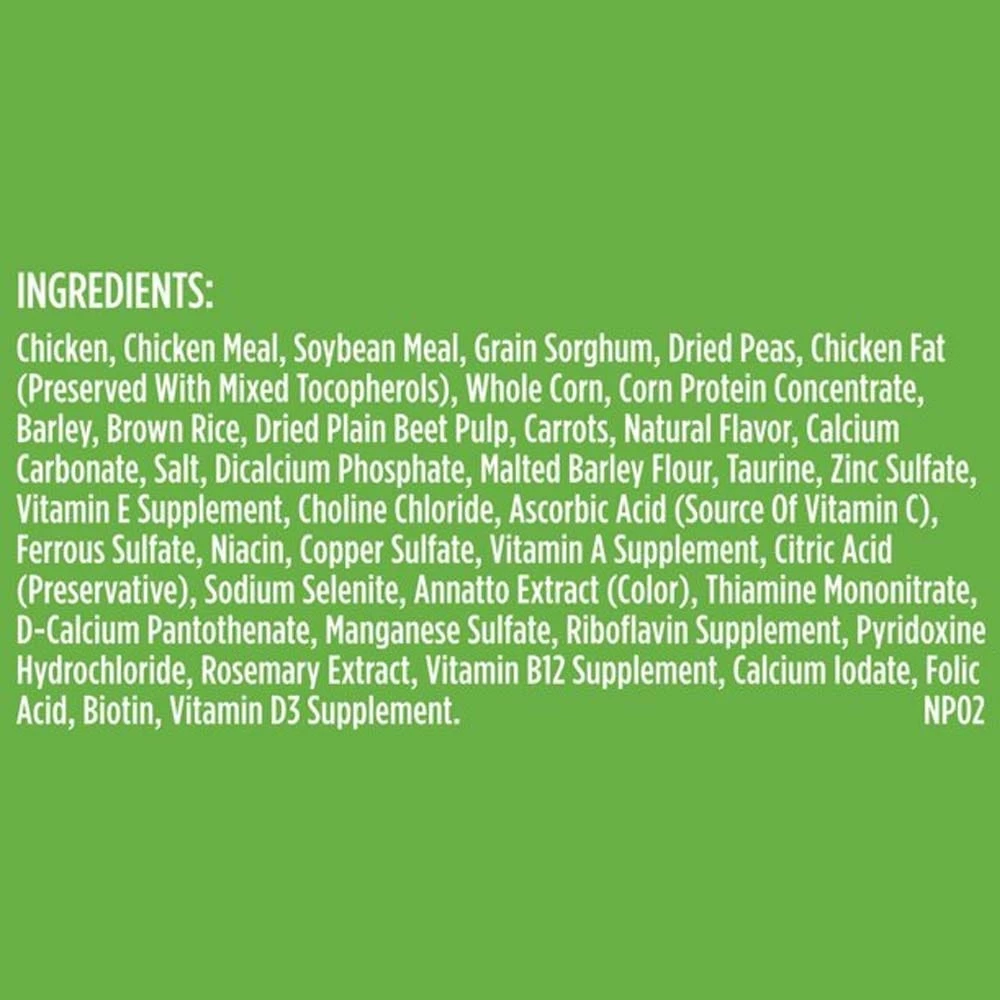 Chicken, Chicken Meal, Soybean Meal, Grain Sorghum, Dried Peas, Chicken Fat (Preserved with Mixed Tocopherols), Whole Corn, Corn Protein Concentrate, Barley, Brown Rice, Dried Plain Beet Pulp, Carrots, Natural Flavor, Calcium Carbonate, Salt, Dicalcium Phosphate, Malted Barley Flour, Inulin, Taurine, Zinc Sulfate, Vitamin E Supplement, Choline Chloride, Ascorbic Acid (Source of Vitamin C), Ferrous Sulfate, Niacin, Copper Sulfate, Vitamin A Supplement, Citric Acid (preservative), Sodium Selenite, Annatto Extract (Color), Thiamine Mononitrate, d-Calcium Pantothenate, Manganese Sulfate, Riboflavin Supplement, Pyridoxine Hydrochloride, Rosemary Extract, Vitamin B12 Supplement, Calcium Iodate, Folic Acid, Biotin, Vitamin D3 Supplement.