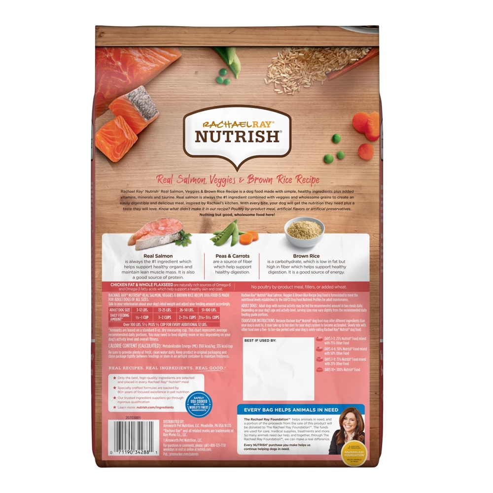 Give your dog a real catch at mealtime with Rachael Ray Nutrish Real Salmon, Veggies & Brown Rice Recipe. This natural dry dog food recipe is made with simple, delicious ingredients plus added vitamins, minerals and taurine to help support your dog’s digestive health and give them the nutrition they need. The recipe’s number one ingredient, real salmon, is rich in protein to help support healthy organs and maintain lean muscle mass. Salmon is a premium protein source that can be a healthy way to add variety to your dog’s meals. Brown rice, peas and carrots are great sources of fiber to help support gentle, healthy digestion. Plus, there’s no poultry by-product meal, fillers, or added wheat, and no artificial flavors or preservatives. Just good, wholesome food inspired by Rachael’s kitchen that your dog is sure to love.