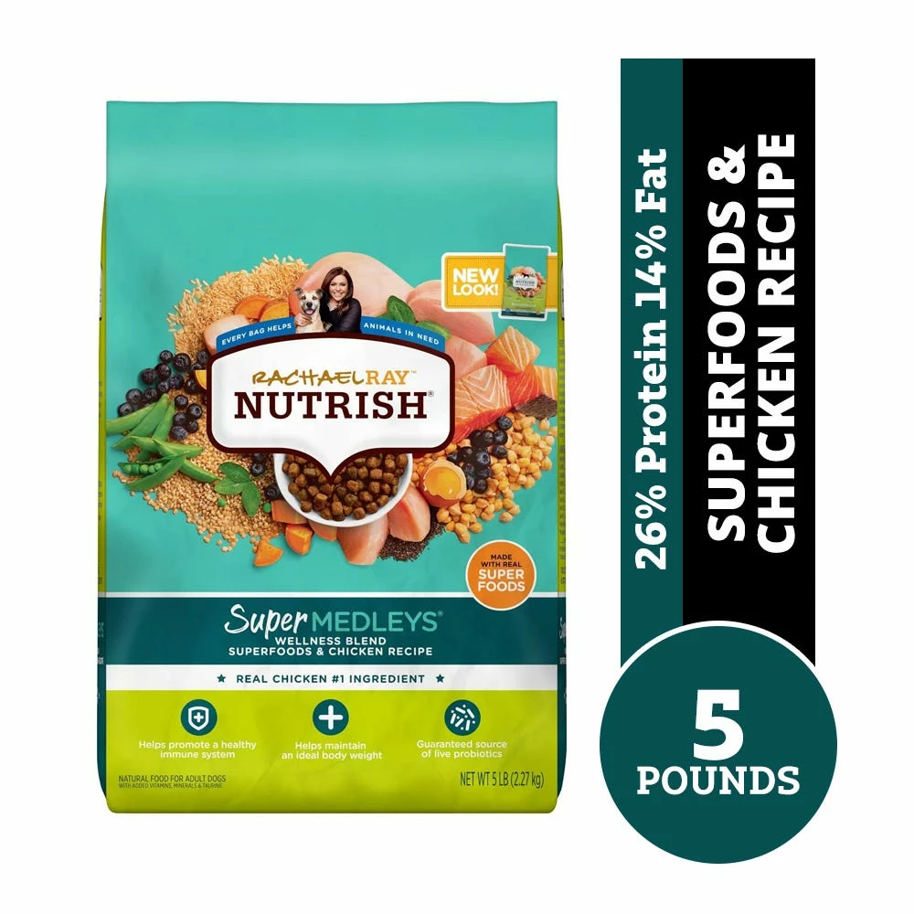 Support your four-legged friend from head to tail with Rachael Ray Nutrish Super Medleys Wellness Blend Superfoods & Chicken Recipe. This delicious, super premium dry food for dogs features real chicken as the number one ingredient—a protein source that promotes healthy organs and lean muscle mass. It is formulated to support total wellness with all the best wholesome superfoods as well as live probiotics to aid in digestion. This high-quality, dry dog food does not contain any artificial flavors, preservatives or poultry by-product meal—but it does include vitamins, minerals and taurine to help keep your furry buddy living his best life!