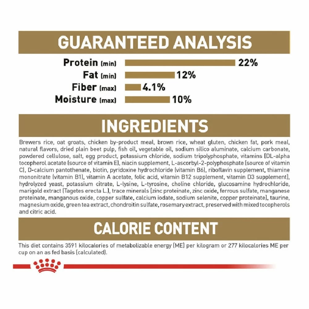 Brewers Rice, Oat Groats, Chicken By-Product Meal, Brown Rice, Wheat Gluten, Chicken Fat, Pork Meal, Natural Flavors, Dried Plain Beet Pulp, Fish Oil, Vegetable Oil, Sodium Silico Aluminate, Calcium Carbonate, Powdered Cellulose, Salt, Egg Product, Potassium Chloride, Sodium Tripolyphosphate, Vitamins [Dl-Alpha Tocopherol Acetate (Source Of Vitamin E), Niacin Supplement, L-Ascorbyl-2-Polyphosphate (Source Of Vitamin C), D-Calcium Pantothenate, Biotin, Pyridoxine Hydrochloride (Vitamin B6), Riboflavin Supplement, Thiamine Mononitrate (Vitamin B1), Vitamin A Acetate, Folic Acid, Vitamin B12 Supplement, Vitamin D3 Supplement], Hydrolyzed Yeast, Potassium Citrate, L-Lysine, L-Tyrosine, Choline Chloride, Glucosamine Hydrochloride, Marigold Extract (Tagetes Erecta L.), Trace Minerals [Zinc Proteinate, Zinc Oxide, Ferrous Sulfate, Manganese Proteinate, Manganous Oxide, Copper Sulfate, Calcium Iodate, Sodium Selenite, Copper Proteinate], Taurine, Magnesium Oxide, Green Tea Extract, Chondroitin Sulfate, Rosemary Extract, Preserved With Mixed Tocopherols And Citric Acid.