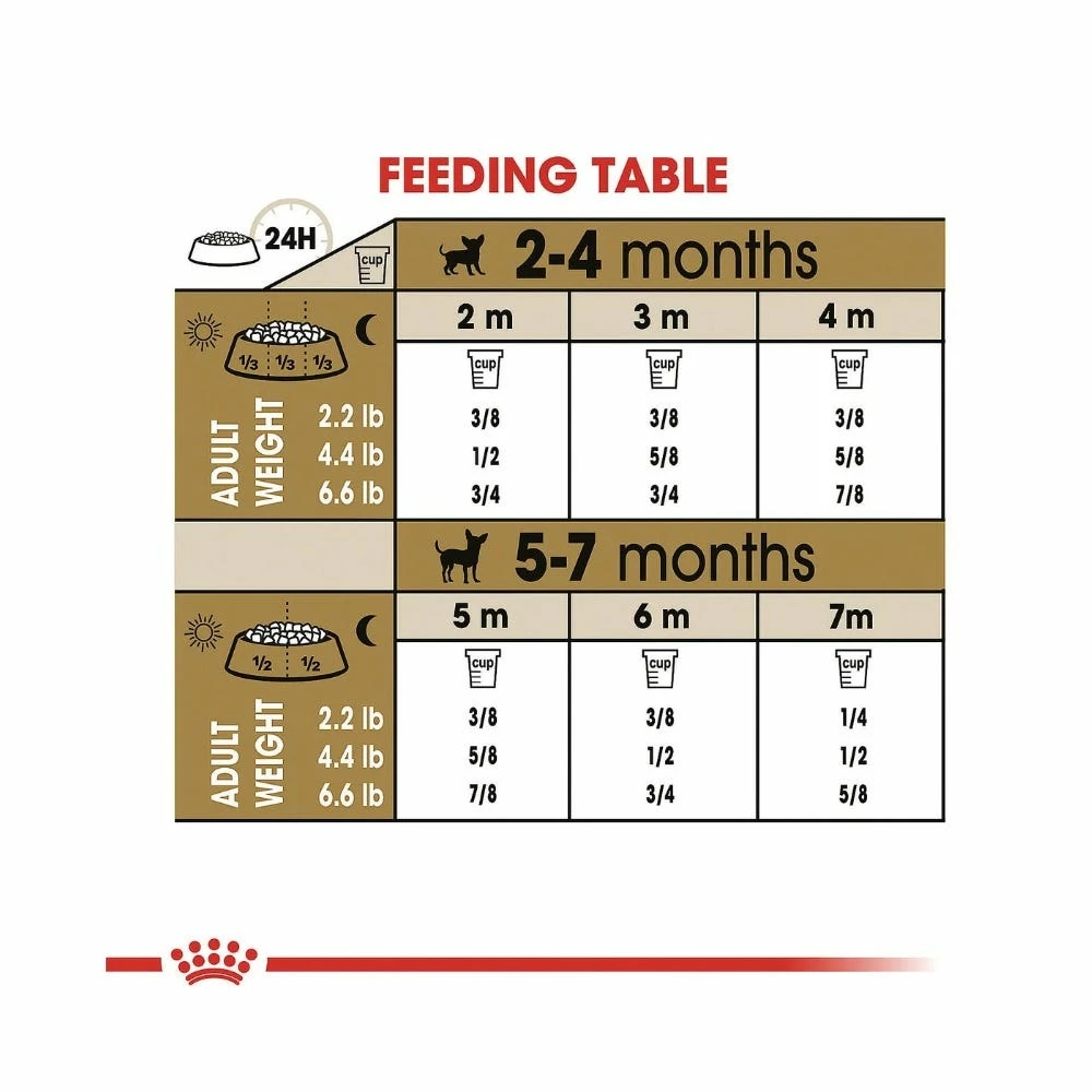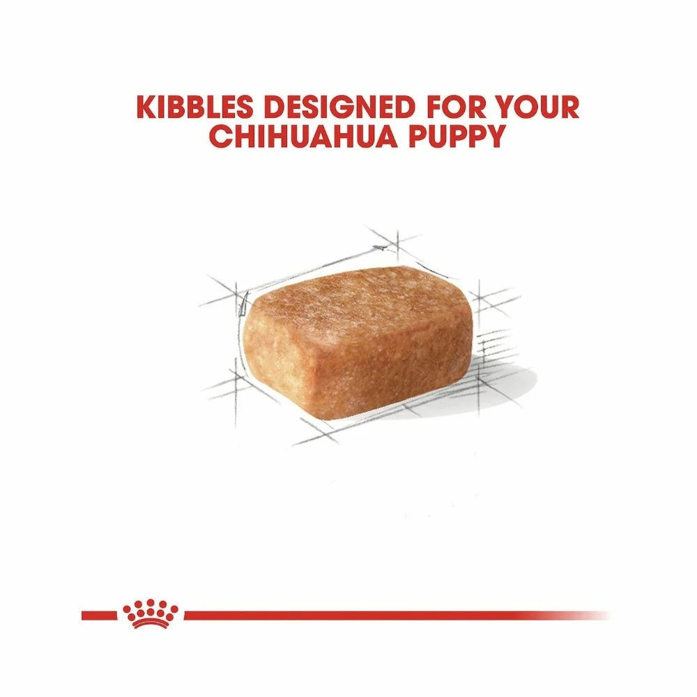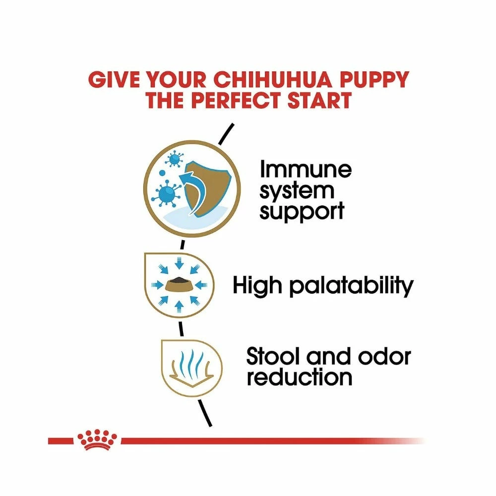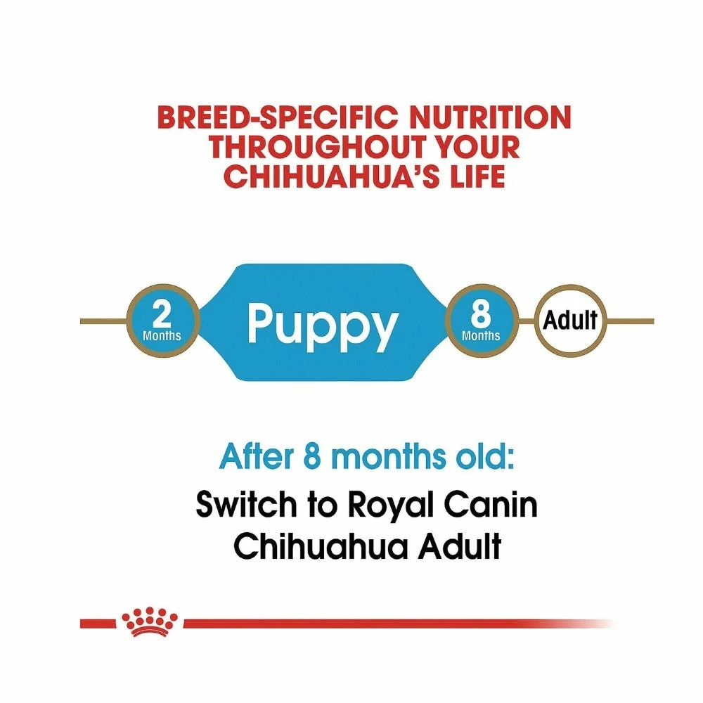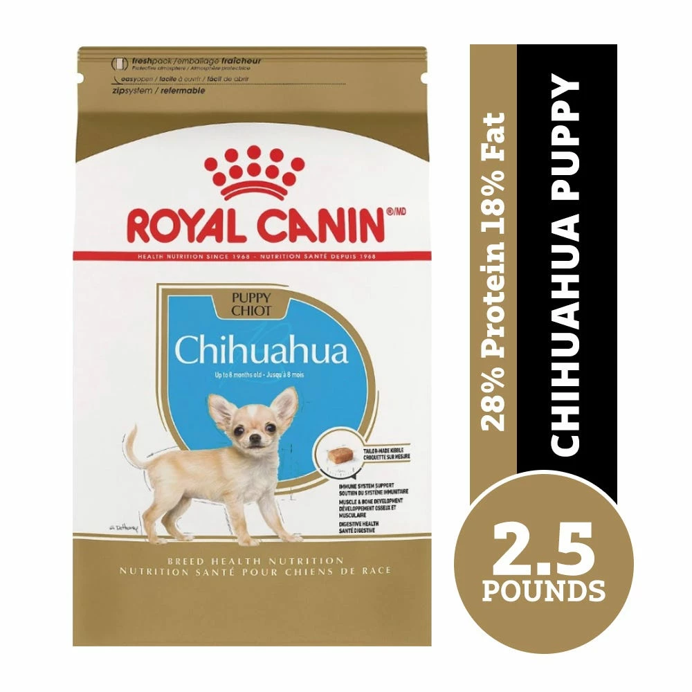 Royal Canin Breed Health Nutrition Chihuahua Puppy Dry Dog Food is tailor-made nutrition created just for your Chihuahua pure breed puppy. Whether you have a deer head, apple head, fawn, or teacup, this exclusive breed-specific diet is uniquely formulated for your small breed, with the specific nutrients to help little dogs thrive. The small, specialized kibble is designed for your small dog’s pointed muzzle and tiny jaw, making it easy for him to pick up and chew. An exclusive mix of antioxidants and vitamin E supports healthy development of his immune system and keeps his body growing strong. Highly digestible proteins and precise fiber content support healthy digestion to help promote optimal stool quality and reduce unpleasant stool odors. And the combination of this Chihuahua dog food’s kibble size, exceptional aromas, and flavors is sure to please even a picky eater. Once your small breed Chihuahua puppy is over 8 months old, transition him to Royal Canin Breed Health Nutrition Chihuahua Puppy Dry Dog Food for precise nutrition into the adult years.