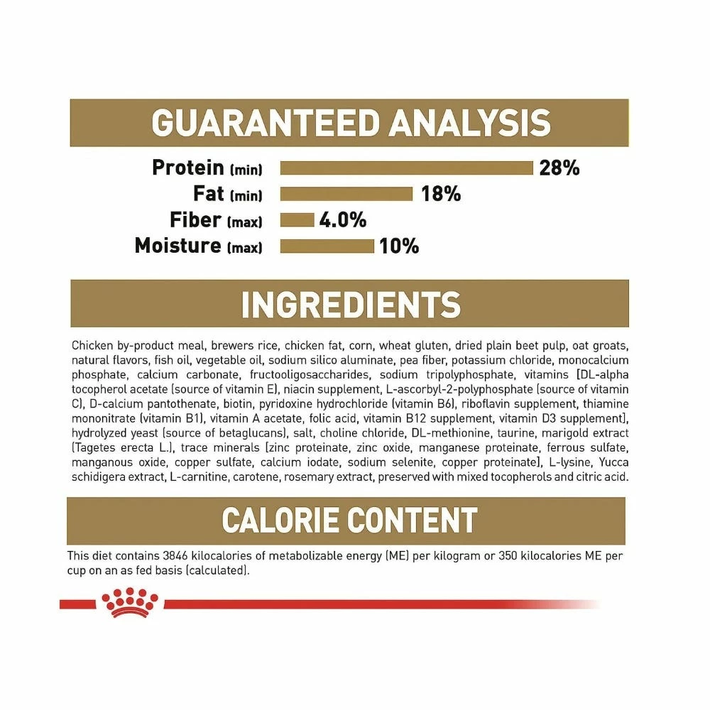 Ingredients: Chicken By-Product Meal, Brewers Rice, Chicken Fat, Corn, Wheat Gluten, Dried Plain Beet Pulp, Natural Flavors, Oat Groats, Fish Oil, Vegetable Oil, Sodium Silico Aluminate, Monocalcium Phosphate, Calcium Carbonate, Pea Fiber, Potassium Chloride, Fructooligosaccharides, Salt, Dl-Methionine, Sodium Tripolyphosphate, Hydrolyzed Yeast, Vitamins [Dl-Alpha Tocopherol Acetate (Source of Vitamin E), Inositol, Niacin Supplement, L-Ascorbyl-2-Polyphosphate (Source of Vitamin C), D-Calcium Pantothenate, Biotin, Pyridoxine Hydrochloride (Vitamin B6), Riboflavin Supplement, Thiamine Mononitrate (Vitamin B1), Vitamin A Acetate, Folic Acid, Vitamin B12 Supplement, Vitamin D3 Supplement], Choline Chloride, Taurine, Marigold Extract (Tagetes Erecta L.), Trace Minerals [Zinc Proteinate, Zinc Oxide, Ferrous Sulfate, Manganese Proteinate, Manganous Oxide, Copper Sulfate, Calcium Iodate, Sodium Selenite, Copper Proteinate], L-Carnitine, Rosemary Extract, Preserved with Mixed Tocopherols and Citric Acid. Caloric Content: 3846 kcal/kg 1 cup = 8 oz. This is only a guide. Optimal feeding amounts may vary according to your pet’s temperament, activity level and environment. If you have any questions regarding your pet’s health, please contact your veterinarian.