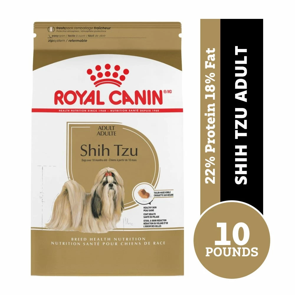 Royal Canin Breed Health Nutrition Shih Tzu Adult Dry Dog Food is tailor-made nutrition created just for your Shih Tzu pure breed. This exclusive breed-specific diet is uniquely formulated for your small breed with specific nutrients to help him thrive. The specialized kibble shape and texture are designed for your small dog’s short muzzle and underbite, making it easy for your toy breed to pick up and chew. An exclusive complex of nutrients reinforces the skin barrier to maintain your Shih Tzu’s skin health. Omega-3 and omega-6 fatty acids and biotin give long coats softness and shine. And this Shih Tzu dog food has a combination of highly digestible proteins, precise fiber content, and high-quality carbohydrate sources to support healthy digestion to help reduce stool volume. Mix in or complement with Royal Canin Shih Tzu Adult Wet Dog Food for a tasty meal that’s sure to please picky eaters and your little lion’s appetite.