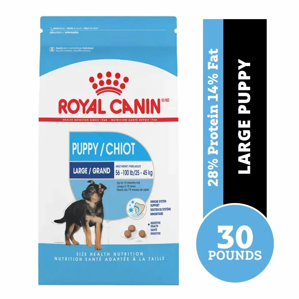 - Royal Canin Large Puppy dry dog food (formerly Maxi Puppy) is tailor-made for large breed puppies with an expected adult weight of 56-100 lbs.
