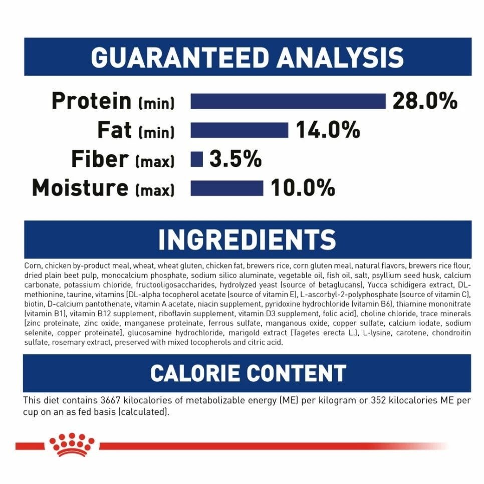 Corn, chicken by-product meal, wheat, wheat gluten, chicken fat, brewers rice, corn gluten meal, natural flavors, brewers rice flour, dried plain beet pulp, monocalcium phosphate, sodium silico aluminate, vegetable oil, fish oil, salt, psyllium seed husk, calcium carbonate, potassium chloride, fructooligosaccharides, hydrolyzed yeast (source of betaglucans), Yucca schidigera extract, DL-methionine, taurine, vitamins [DL-alpha tocopherol acetate (source of vitamin E), L-ascorbyl-2-polyphosphate (source of vitamin C), biotin, D-calcium pantothenate, vitamin A acetate, niacin supplement, pyridoxine hydrochloride (vitamin B6), thiamine mononitrate (vitamin B1), vitamin B12 supplement, riboflavin supplement, vitamin D3 supplement, folic acid], choline chloride, trace minerals [zinc proteinate, zinc oxide, manganese proteinate, ferrous sulfate, manganous oxide, copper sulfate, calcium iodate, sodium selenite, copper proteinate], glucosamine hydrochloride, marigold extract (Tagetes erecta L.), L-lysine, carotene, chondroitin sulfate, rosemary extract, preserved with mixed tocopherols and citric acid.