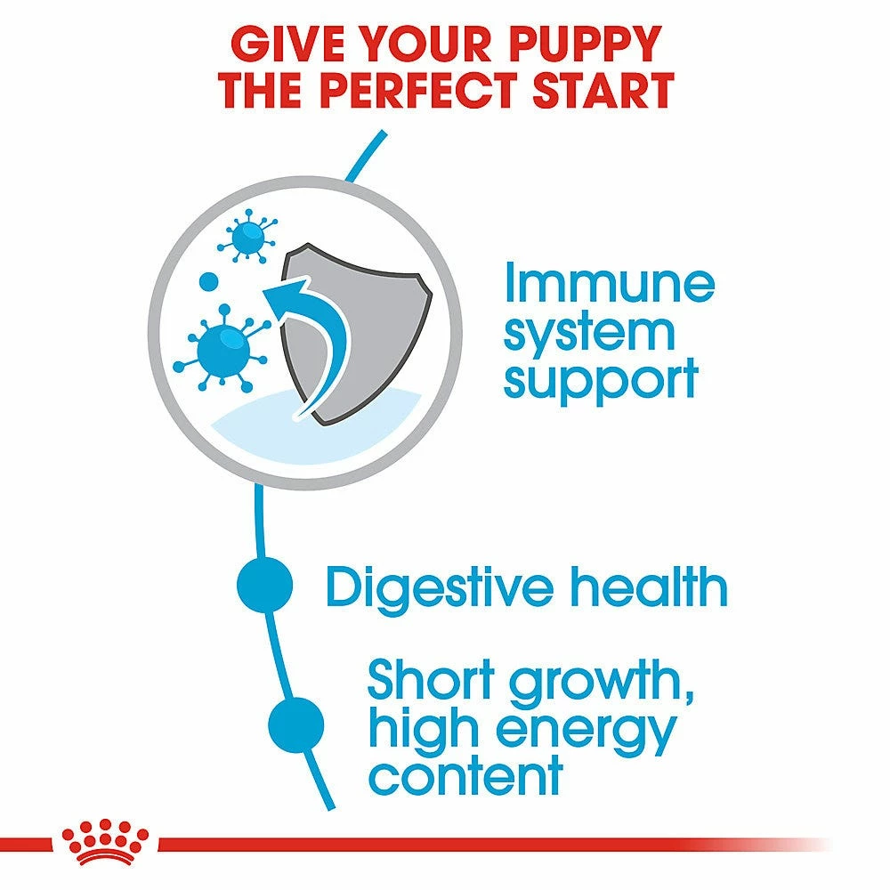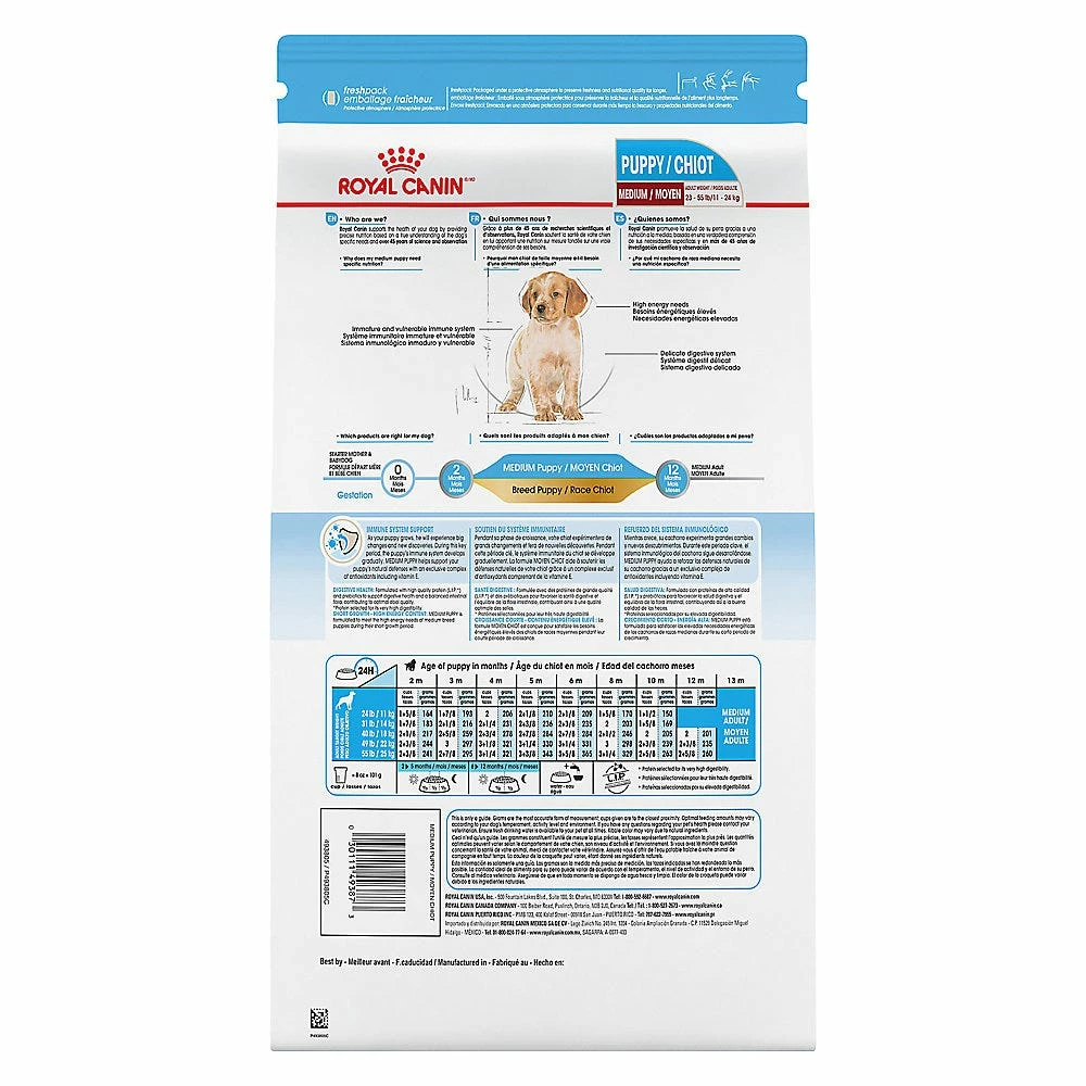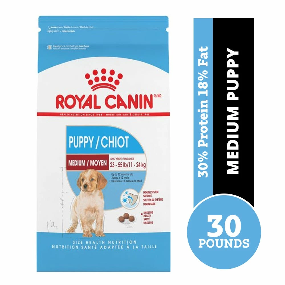 - Royal Canin Medium Puppy dry dog food is tailor-made for puppies up to 1 year old with an expected adult weight of 23-55 lbs.