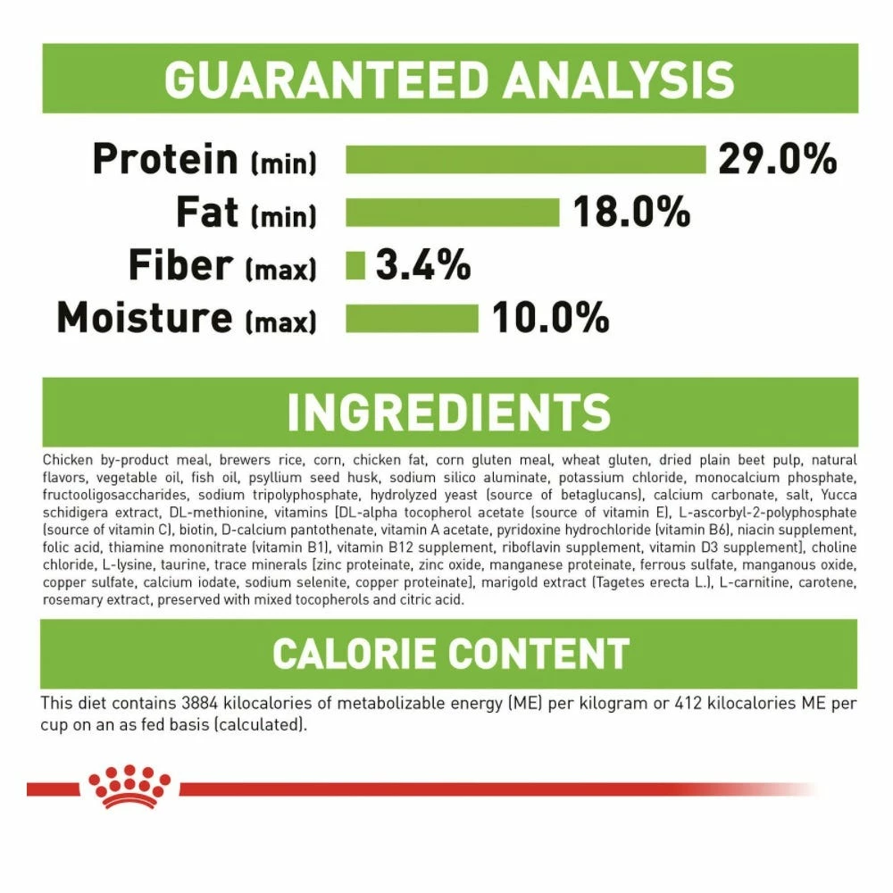 Chicken By-Product Meal, Brewers Rice, Corn, Chicken Fat, Corn Gluten Meal, Wheat Gluten, Dried Plain Beet Pulp, Natural Flavors, Vegetable Oil, Fish Oil, Psyllium Seed Husk, Sodium Silico Aluminate, Potassium Chloride, Monocalcium Phosphate, Fructooligosaccharides, Sodium Tripolyphosphate, Hydrolyzed Yeast (Source Of Beta glucans), Calcium Carbonate, Salt, Yucca Schidigera Extract, DL-Methionine, Vitamins [DL-Alpha Tocopherol Acetate (Source Of Vitamin E), L-Ascorbyl-2-Polyphosphate (Source Of Vitamin C), Biotin, D-Calcium Pantothenate, Vitamin A Acetate, Pyridoxine Hydrochloride (Vitamin B6), Niacin Supplement, Folic Acid, Thiamine Mononitrate (Vitamin B1), Vitamin B12 Supplement, Riboflavin Supplement, Vitamin D3 Supplement], Choline Chloride, L-Lysine, Taurine, Trace Minerals [Zinc Proteinate, Zinc Oxide, Manganese Proteinate, Ferrous Sulfate, Manganous Oxide, Copper Sulfate, Calcium Iodate, Sodium Selenite, Copper Proteinate], Marigold Extract (Tagetes Erecta L.), L-Carnitine, Carotene, Rosemary Extract, Preserved With Mixed Tocopherols And Citric Acid.