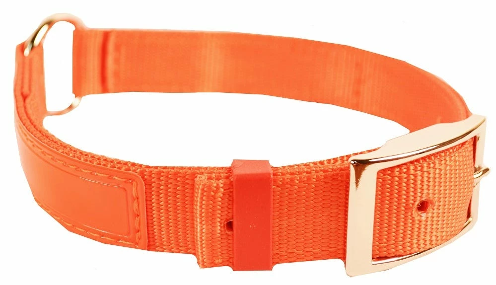 This double-ply florescent orange nylon collar is made with Relexite to make it highly visible. The center ring helps collar roll if it gets caught or snagged. It is resin treated for extra strength.;