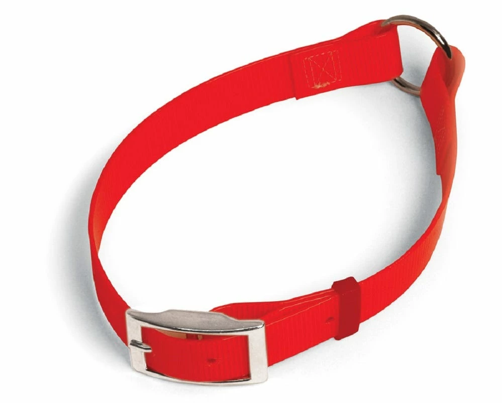 This collar from Scott Pets is great for outdoor use. With the bright orange color it is easily visible in high grass and open spaces. Made from biothane and has a strong center ring.