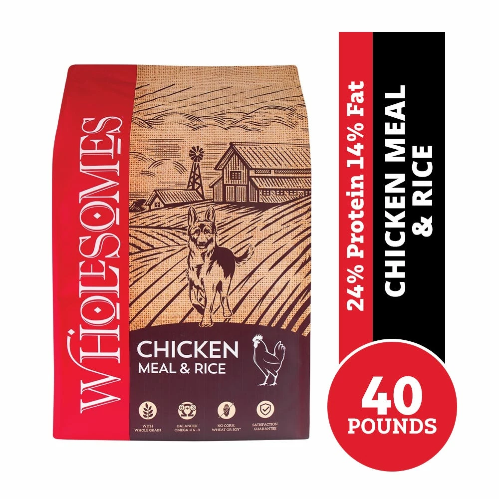 Wholesomes Chicken Meal & Rice Formula is designed for dogs in need of a high energy food from a single high quality protein source. Formulated without common grains like corn, wheat or soybeans, Wholesomes Chicken Meal & Rice supplies your dog with a 100% complete and balanced diet for a healthy, active life. This tasty recipe also nutritionally balances Omega-6 and Omega-3 fatty acids to promote good skin and a glossy coat, and contains natural vegetable fibers support digestive health.