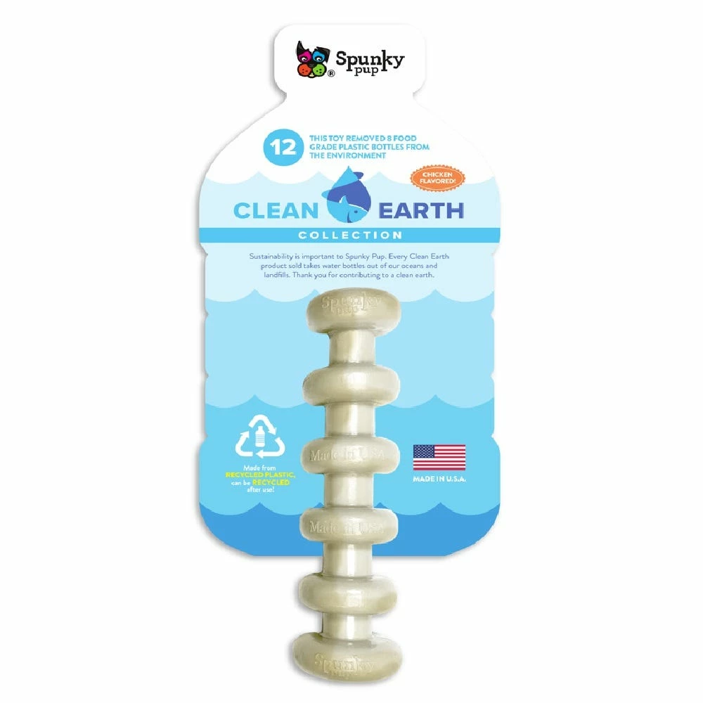 Now you and your dog can help remove waste plastic from the environment one toy at a time! Clean Earth Heavy Duty chew toys are made from 100% Recycled plastic water bottles. Each toy redirects waste from up to 12 plastic water bottles from ending up in oceans, waterways and landfills. Clean Earth chew toys are super-durable and and feature Chicken Flavoring your dog will love. Not only are Clean Earth toys recyclable, but each toy can be recycled when you dog is done playing with it which means Infinite Loop Recycling!