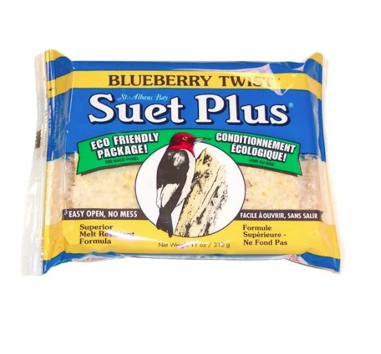 Our Suet Cake Blueberry Twist Blend is made from our Superior Melt-Resistant Suet Formula! These amazing suet cakes are sure to delight any wild bird and give them the energy they need. The 11 oz. Blueberry Twist Blend Suet Cakes contain wholesome ingredients such as Rendered Beef Suet, Cracked Corn, Millet, and Black Oil Sunflower Seeds. Made in USA.