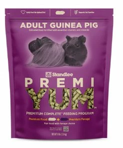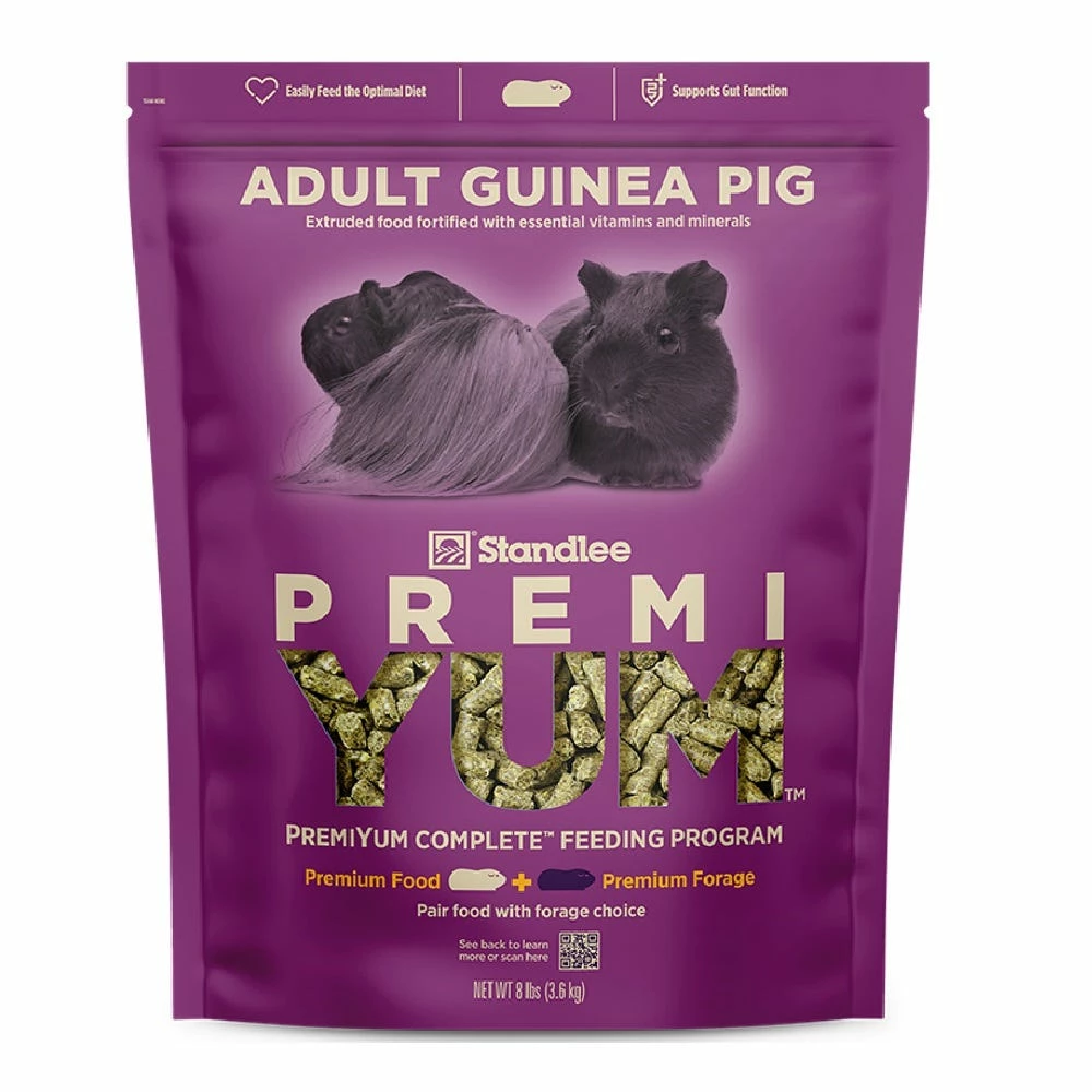 PremiYum™ Adult Guinea Pig Fortified Food is for guinea pigs over 5 months of age. Feed 1⁄4 cup of fortified food per 1 lb. of animal weight at a minimum. Example: An average guinea pig weighs 2 lbs. and should have access to a 1⁄2 cup of fresh fortified food per day. Adjust quantity based on animal’s body condition. Always feed free-choice, clean forage and provide fresh water to assure a healthy animal. Remove any soiled or damp food as needed. See PremiYum Complete™ matrix above for Standlee Hand-Selected Forage variety recommendations. Consult with your veterinarian when changing your animal’s diet.