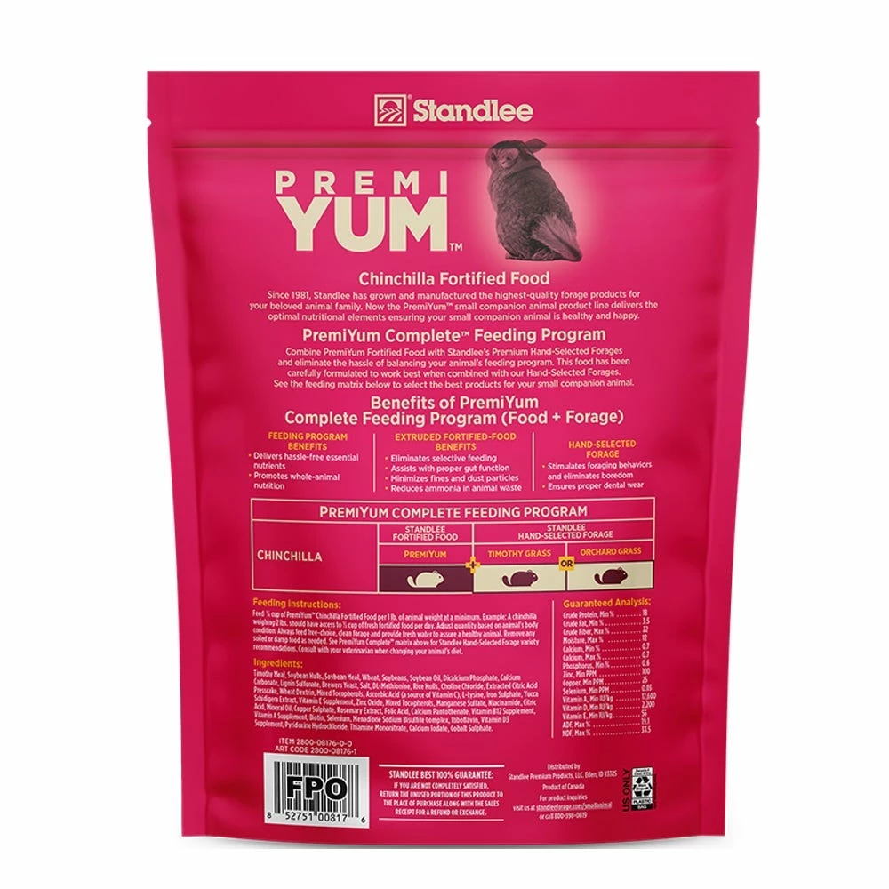 Feed 1⁄4 cup of PremiYum™ Chinchilla Fortified Food per 1 lb of animal weight at a minimum. Example: A chinchilla weighing 2 lbs. should have access to 1⁄2 cup of fresh fortified food per day. Adjust quantity based on animal’s body condition. Always feed free-choice, clean forage and provide fresh water to assure a healthy animal. Remove any soiled or damp food as needed. See PremiYum Complete™ matrix above for Standlee Hand-Selected Forage variety recommendations. Consult with your veterinarian when changing your animal’s diet.