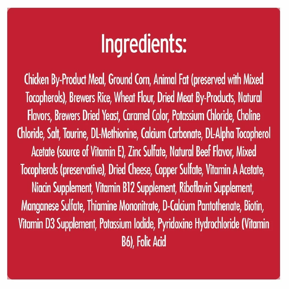 Chicken By-Product Meal, Ground Corn, Animal Fat (preserved with Mixed Tocopherols), Brewers Rice, Wheat Flour, Dried Meat By-Products, Natural Flavors, Brewers Dried Yeast, Caramel Color, Potassium Chloride, Choline Chloride, Salt, Taurine, DL-Methionine, Calcium Carbonate, DL-Alpha Tocopherol Acetate (source of Vitamin E), Zinc Sulfate, Natural Beef Flavor, Mixed Tocopherols (preservative), Dried Cheese, Copper Sulfate, Vitamin A Acetate, Niacin Supplement, Vitamin B12 Supplement, Riboflavin Supplement, Manganese Sulfate, Thiamine Mononitrate, D-Calcium Pantothenate, Biotin, Vitamin D3 Supplement, Potassium Iodide, Pyridoxine Hydrochloride (Vitamin B6), Folic Acid.