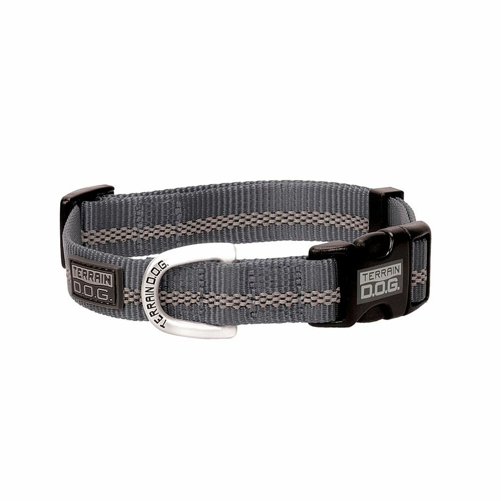Adjustable nylon dog collars feature a reflective safety stripe and extra durable anodized aluminum dees for reliability perfect for any active canine. A quick-release buckle lends on-the-go ease to this precise-fit, single-ply collar.