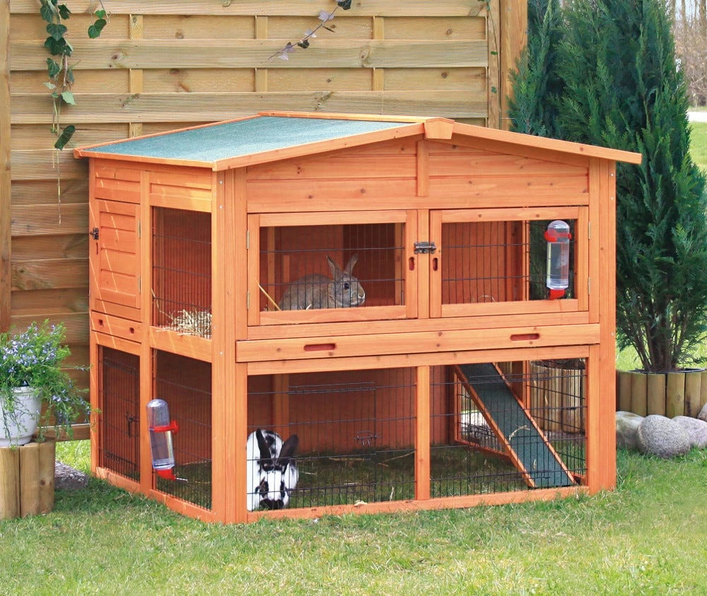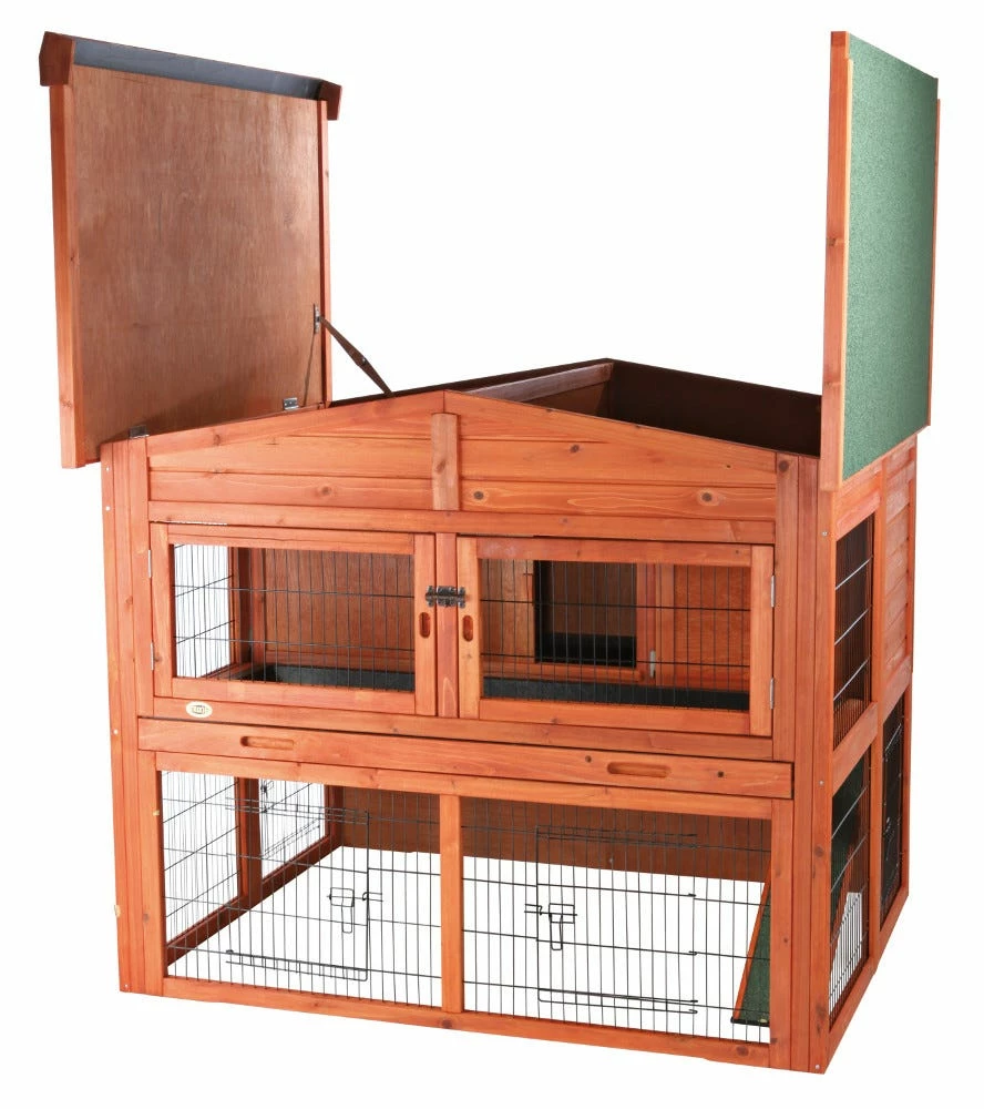 TRIXIE’s Large 2-Story Rabbit Hutch with Attic is ideal for small groups of animals such as rabbits and guinea pigs. The two-story design allows your pets to roam inside and outside, upstairs and downstairs, in the sun or in the shade for ideal comfort. Solid wood construction, glazed pine finish, and our finest materials mean this hutch will endure years of use with very little maintenance.