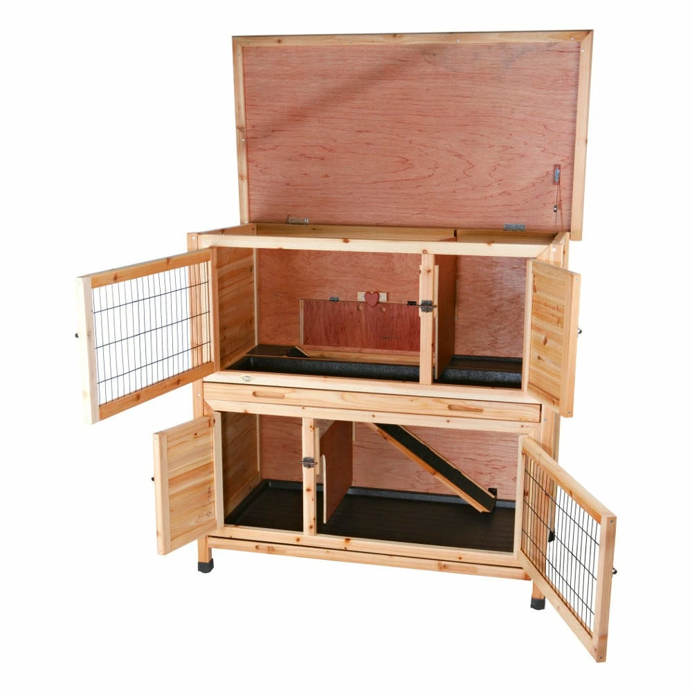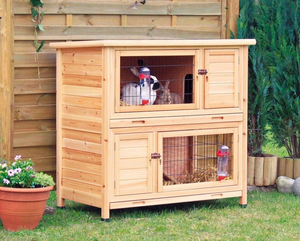 TRIXIE’s Medium 2-Story Rabbit Hutch is ideal for small groups of animals such as rabbits and guinea pigs. Solid wood construction, glazed pine finish, and our finest materials mean this hutch will endure years of use with very little maintenance.