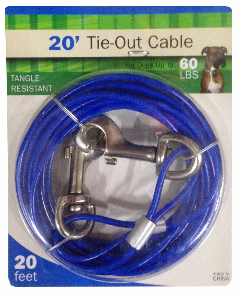 This medium cable tie out has a break strength of 920 lbs. It is made of galvanized aircraft cable and has a UV vinyl coating, with the reassurance your dog will stay in the yard.