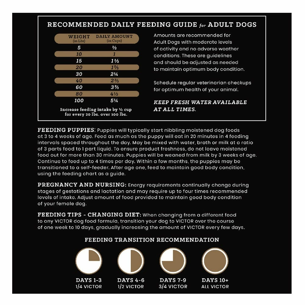 When changing from a different food to any VICTOR dog food formula, transition your dog to VICTOR over the course of one week to 10 days, gradually increasing the amount of VICTOR every few days.