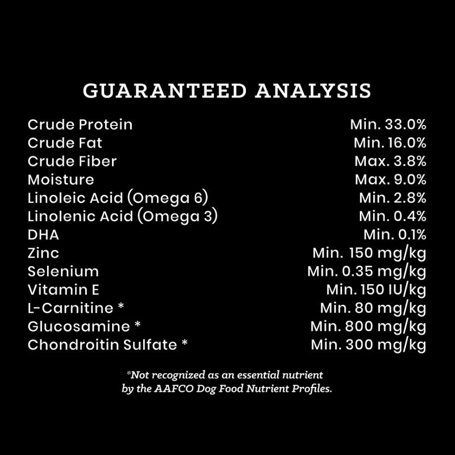 Beef Meal, Peas, Sweet Potato, Chicken Fat (preserved with Mixed Tocopherols), Menhaden Fish Meal (Source of DHA-Docosahexaenoic Acid), Blood Meal Conventionally Dried, Garbanzo Beans, Pork Meal, Yeast Culture, Dehydrated Alfalfa Meal, Natural Flavor, Potassium Chloride, Carrot Powder, Tomato Pomace, Salt, Organic Dried Seaweed Meal, Taurine, Choline Chloride, Calcium Stearate, Zinc Methionine Complex, Glucosamine Hydrochloride, Vitamin E Supplement, DL-Methionine, Iron Amino Acid Complex, Hydrolyzed Yeast, Chondroitin Sulfate, Manganese Amino Acid Complex, Silicon Dioxide, L-Carnitine, Selenium Yeast, Brewers Dried Yeast, Dried Enterococcus Faecium Fermentation Product, Dried Lactobacillus Acidophilus Fermentation Product, Dried Aspergillus Oryzae Fermentation Extract, Dried Trichoderma Longibrachiatum Fermentation Extract, Dried Bacillus Subtilis Fermentation Extract, Copper Sulfate, Niacin Supplement, Vitamin B12 Supplement, Vitamin A Supplement, D-Calcium Pantothenate, Thiamine Mononitrate, Biotin, Yucca Schidigera Extract, Calcium Carbonate, Riboflavin Supplement, Calcium Iodate, Pyridoxine Hydrochloride, Vitamin D3 Supplement, Tetrasodium Pyrophosphate, Vegetable Oil, Rosemary Extract, Green Tea Extract, Spearmint Extract, Inulin, Lecithin, Folic Acid