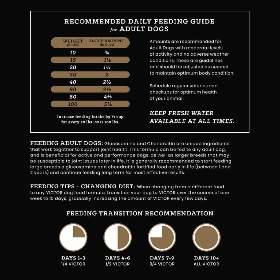 When changing from a different food to any VICTOR dog food formula, transition your dog to VICTOR over the course of one week to 10 days, gradually increasing the amount of VICTOR every few days.