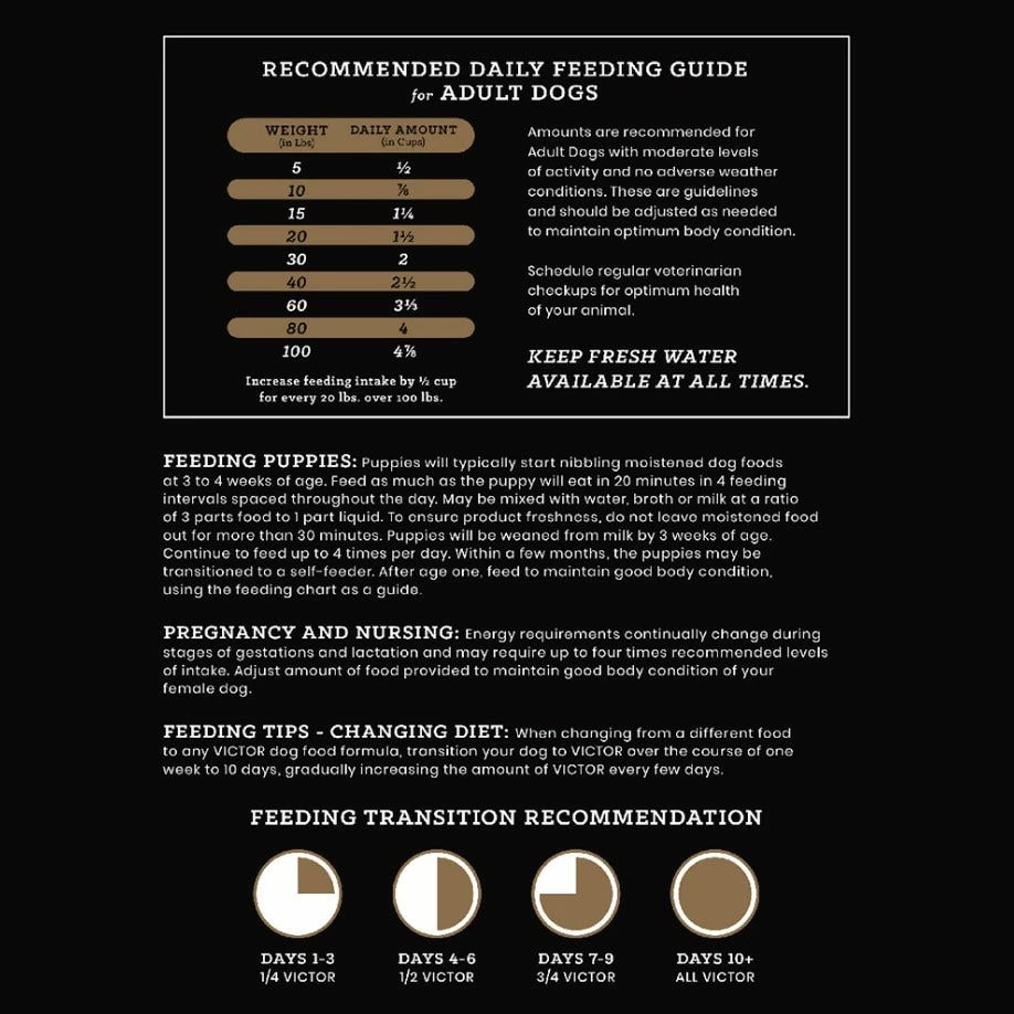 When changing from a different food to any VICTOR dog food formula, transition your dog to VICTOR over the course of one week to 10 days, gradually increasing the amount of VICTOR every few days.