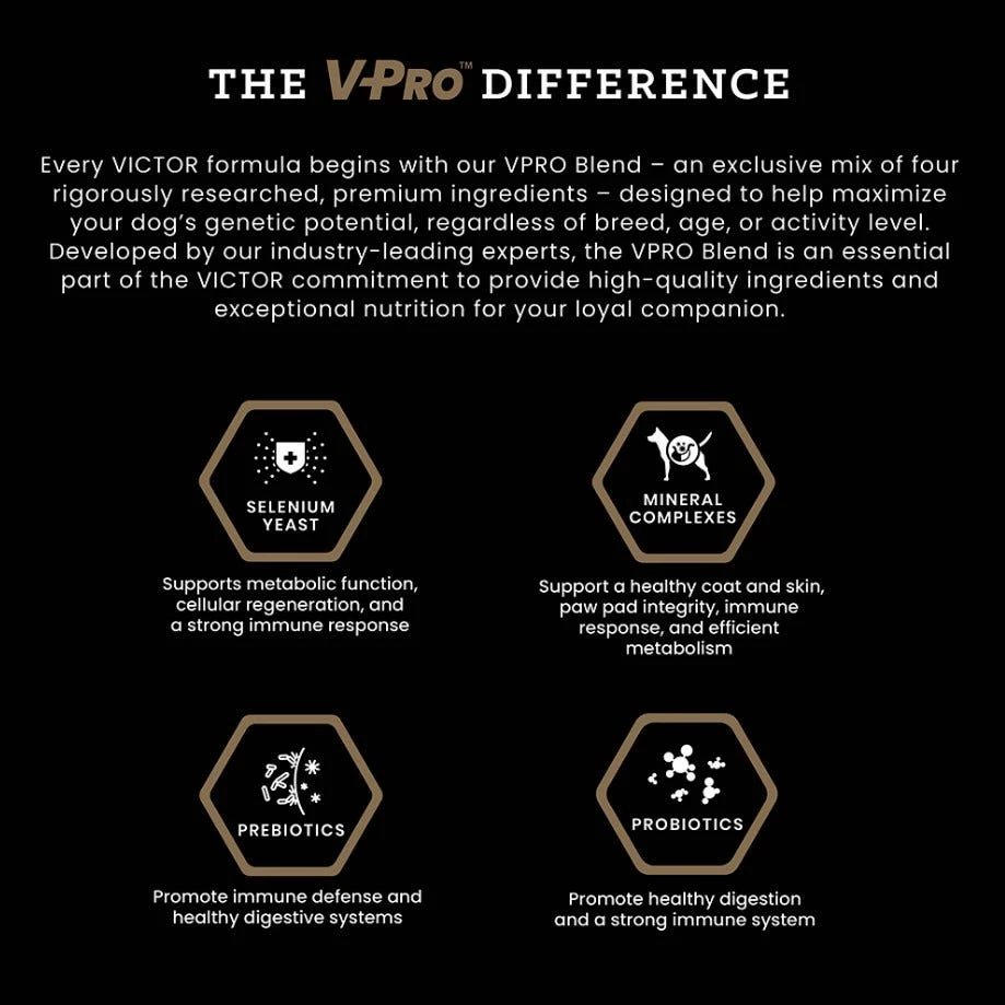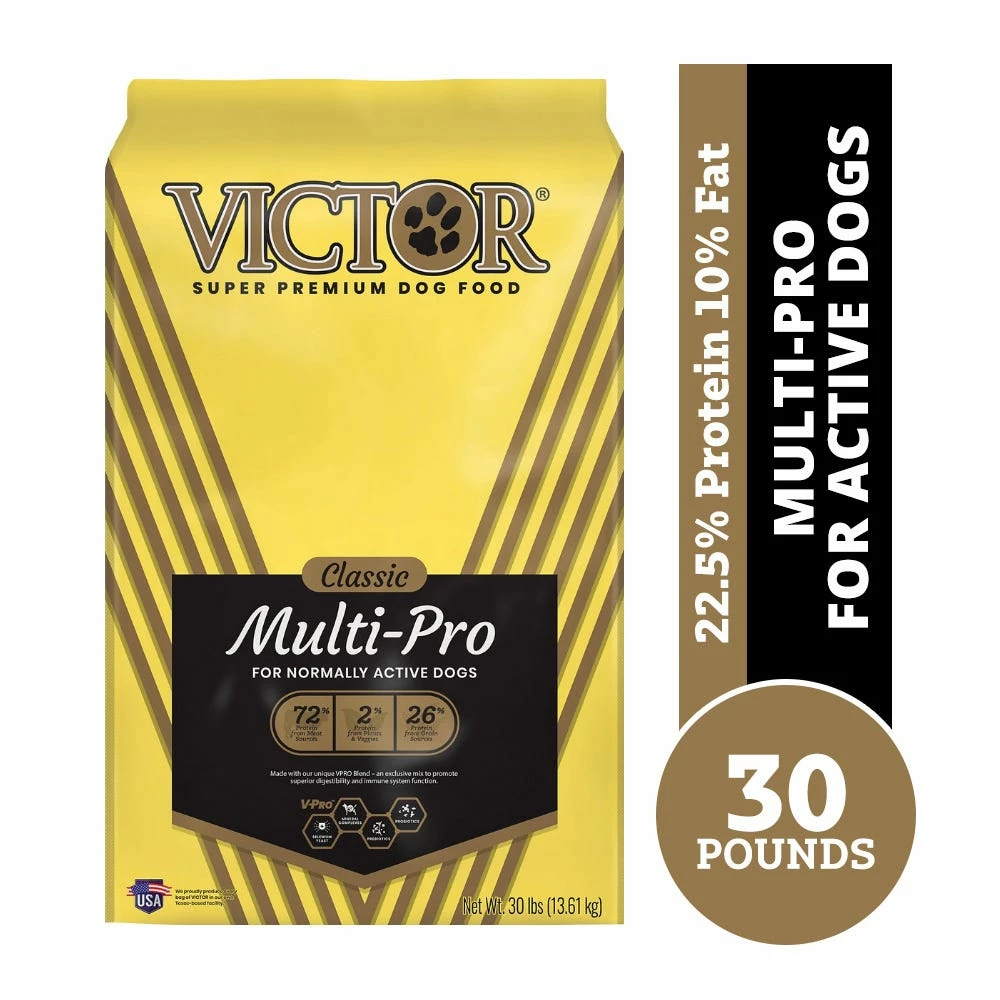 VICTOR Multi-Pro is an excellent choice for normally active dogs, regular maintenance and off-season periods of lower activity. With scientifically advanced and nutritionally complete ingredients, this nutrient-dense, multi-protein formula promotes sustained energy and healthy immune and digestive systems.