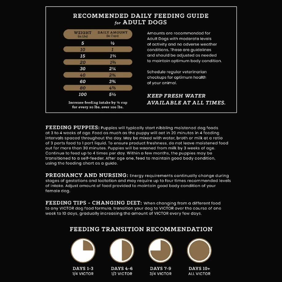 When changing from a different food to any VICTOR dog food formula, transition your dog to VICTOR over the course of one week to 10 days, gradually increasing the amount of VICTOR every few days.