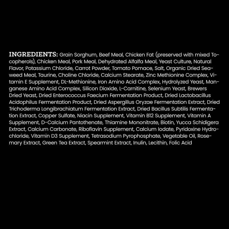 Grain Sorghum, Beef Meal, Chicken Fat (preserved with mixed Tocopherols), Chicken Meal, Pork Meal, Dehydrated Alfalfa Meal, Yeast Culture, Natural Flavor, Potassium Chloride, Carrot Powder, Tomato Pomace, Salt, Organic Dried Seaweed Meal, Taurine, Choline Chloride, Calcium Stearate, Zinc Methionine Complex, Vitamin E Supplement, DL-Methionine, Iron Amino Acid Complex, Hydrolyzed Yeast, Manganese Amino Acid Complex, Silicon Dioxide, L-Carnitine, Selenium Yeast, Brewers Dried Yeast, Dried Enterococcus Faecium Fermentation Product, Dried Lactobacillus Acidophilus Fermentation Product, Dried Aspergillus Oryzae Fermentation Extract, Dried Trichoderma Longibrachiatum Fermentation Extract, Dried Bacillus Subtilis Fermentation Extract, Copper Sulfate, Niacin Supplement, Vitamin B12 Supplement, Vitamin A Supplement, D-Calcium Pantothenate, Thiamine Mononitrate, Biotin, Yucca Schidigera Extract, Calcium Carbonate, Riboflavin Supplement, Calcium Iodate, Pyridoxine Hydrochloride, Vitamin D3 Supplement, Tetrasodium Pyrophosphate, Vegetable Oil, Rosemary Extract, Green Tea Extract, Spearmint Extract, Inulin, Lecithin, Folic Acid