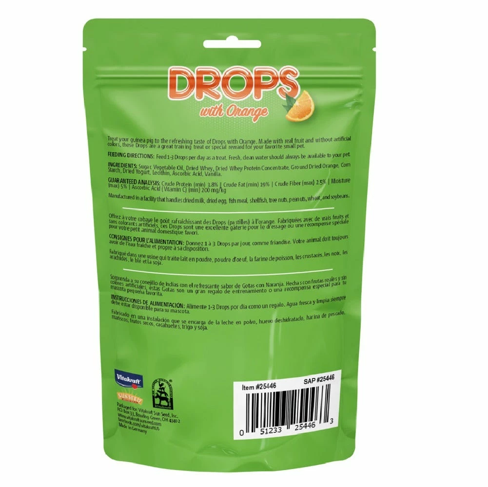 Vitakraft Drops with Orange is a tasty treat for guinea pigs flavored with real oranges. Made with natural whey protein, no artificial colors, and fortified with the extra Vitamin C that all guinea pigs need, Drops are a delicious, sweet treat or special reward your pet will love!