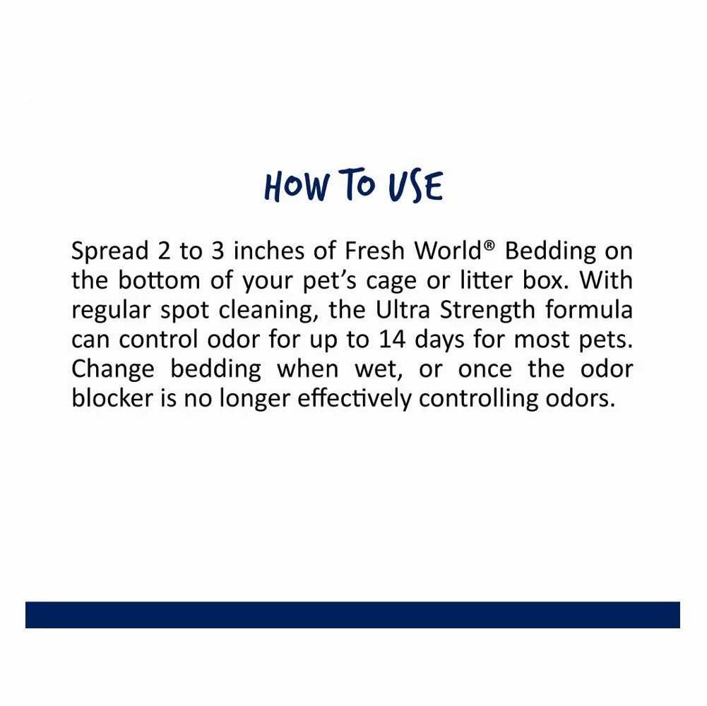 Spread 2 to 3 inches of Fresh World Bedding on the bottom of your pet’s cage or litter box. With regular spot cleaning, the Ultra Strength formula can control odor for up to 14 days for most pets. Change bedding when wet, or once the odor blocker is no longer effectively controlling odors.